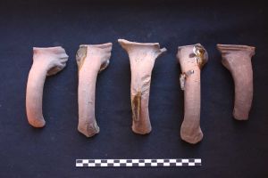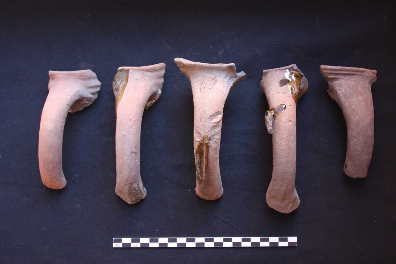 231 kandeskår med pølseformet hank. Spor af fejlbrændinger. Flere med spor af glasur. Farven varierer fra grå - grårød - rød - gul (evt kalkrigt ler/mergel?)