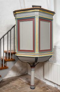 Prædikestol, antageligt fra 1819/20 Litteratur: Danmarks Kirker, Odense Amt hft. 48-49, s. 5401, fig. 36.