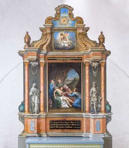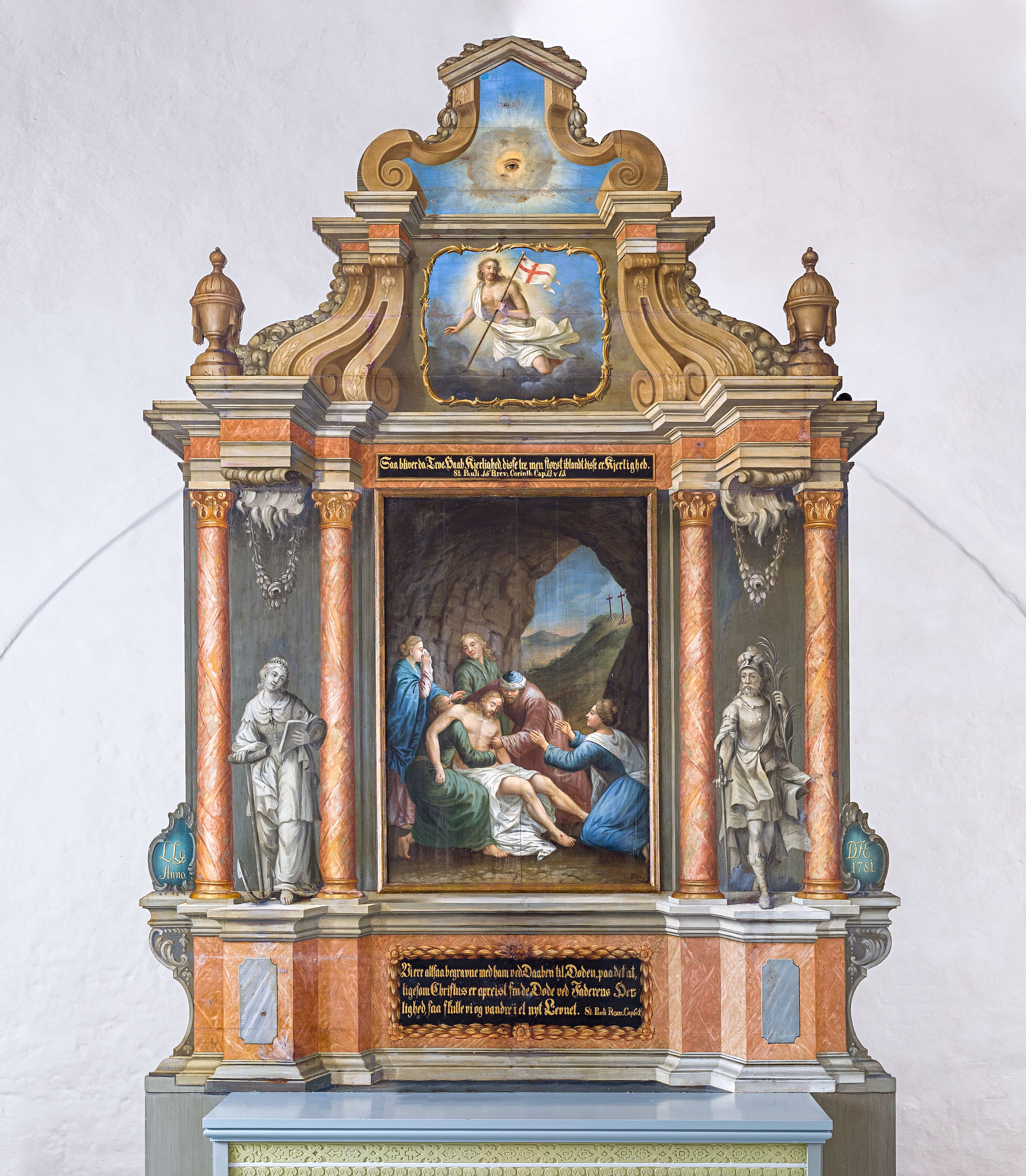 Altertavle, 1781, med illusionistisk bemaling, signeret af Niels Poulsen Dahlin. Litteratur: Danmarks Kirker, Odense Amt, hft. 48-49, s. 5541, fig. 43.