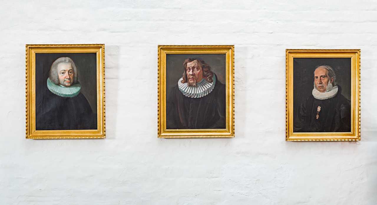 Stefan Viggo Pedersens portrætter af salmedigterne Adolph Brorson (t.v.), Thomas Kingo (m.f.) og N.F.S. Grundtvig (t.h.), 1921.