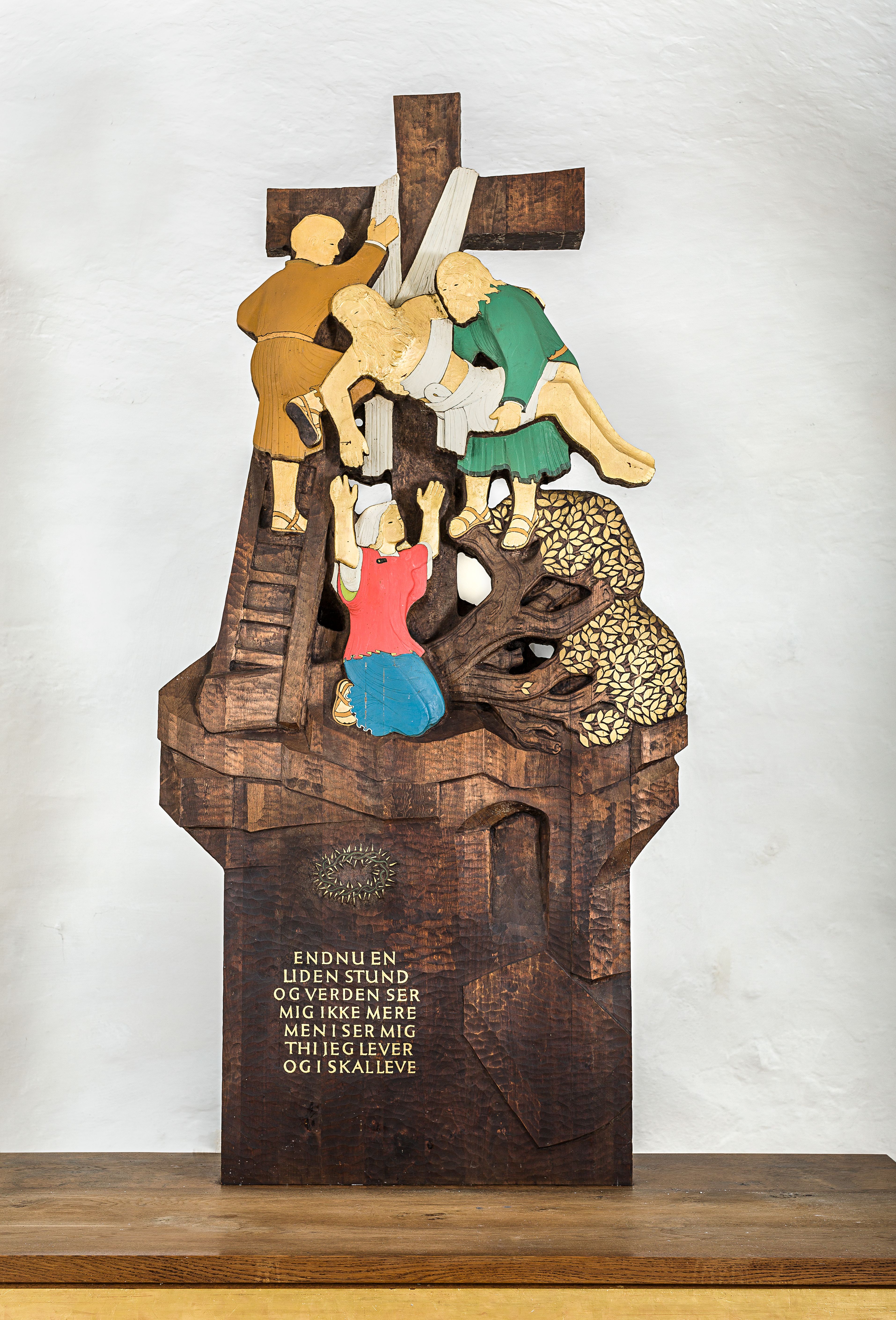 Altertavle, 1959, udført af Kaj Louis Jensen. Litteratur: Danmarks Kirker, Odense Amt, hft. 50-51, s. 5664, fig. 43.