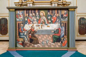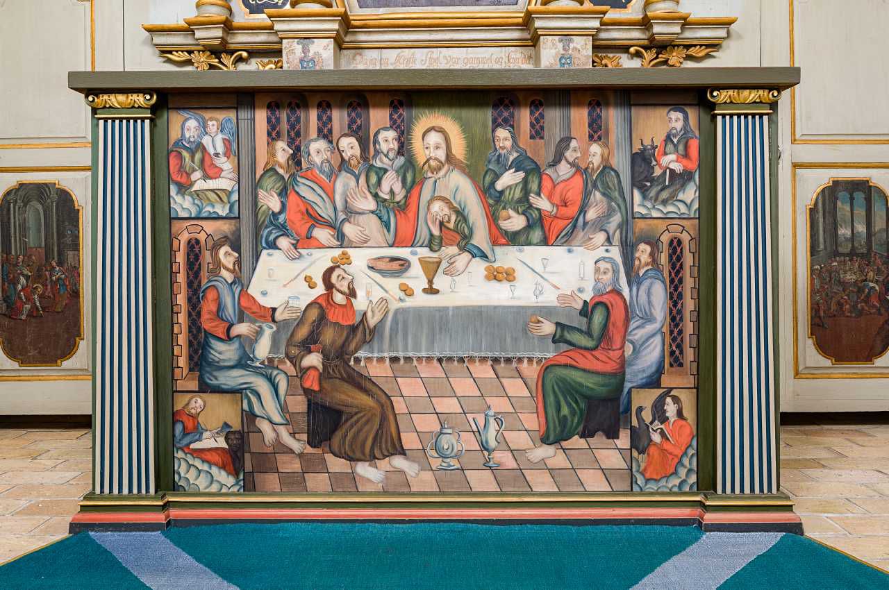 Alterbordsforside, udført 1953 som kopi af †panelfelt, 1629. Litteratur: Danmarks Kirker, Ringkøbing Amt, hft. 29-31, s. 3126, fig. 22.
