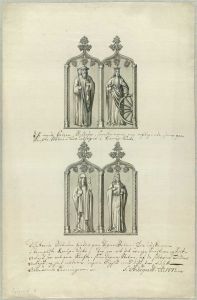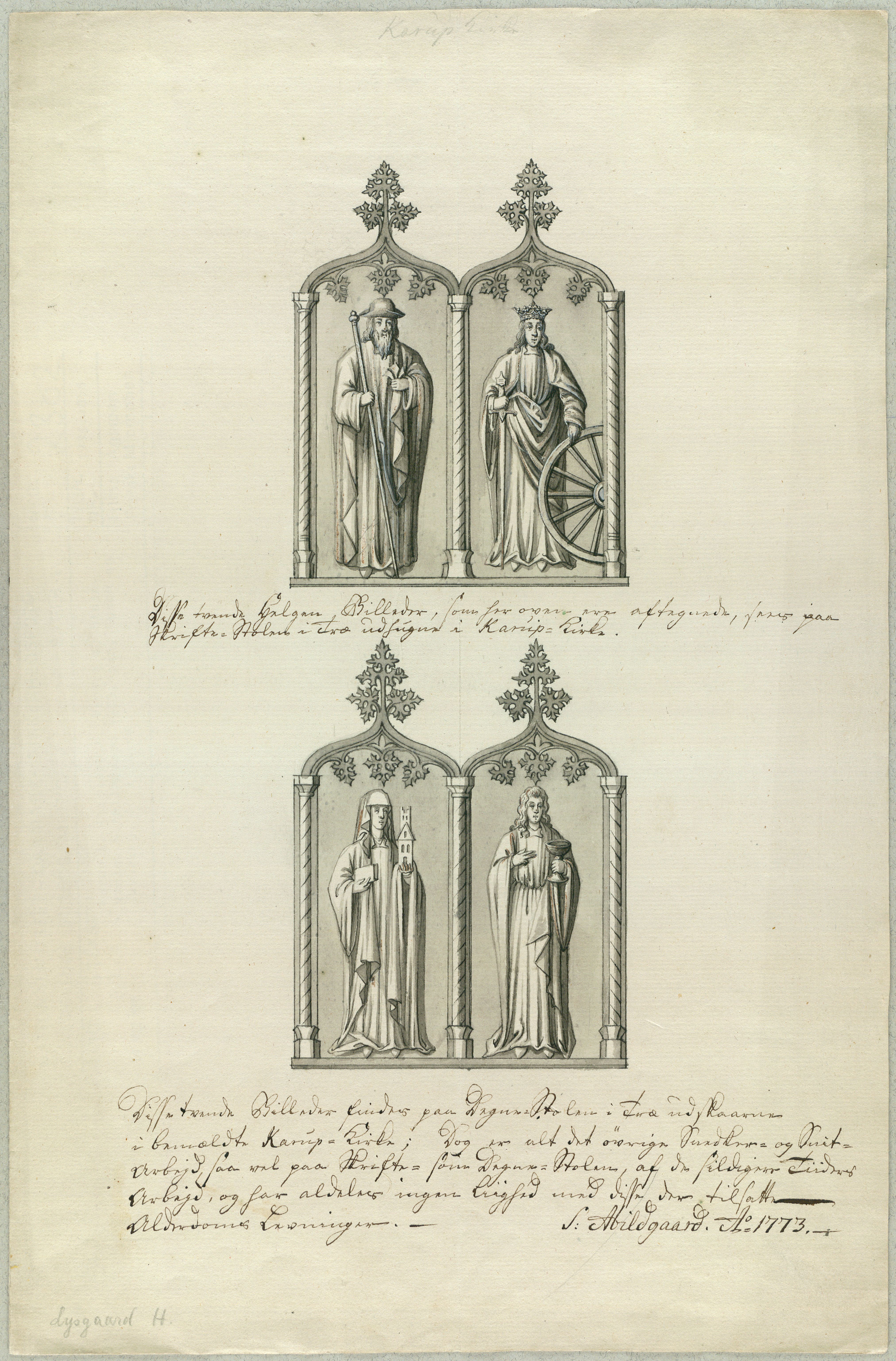 "Disse tvende Helgen Billeder, som her ogsaa ere aftegnede, sees paa Skrifte Stolene i Træ udhugne i Karup Kirke S. Abildgaard Ao 1773. Disse tvende Billeder findes paa Degnestolen i Træ udskaarne i bemældte Karup Kirke; dog er alt det øvrige Snedkere og Snit-Arbejd saa vel som paa Skriften som Degne-Stolen, af de sildigere Tiiders Arbejd, og har aldeles ingen Liighed med disse der tilsatte Alderdoms Levninger. S. Abildgaard Ao 1773." 38 x 50 cm.