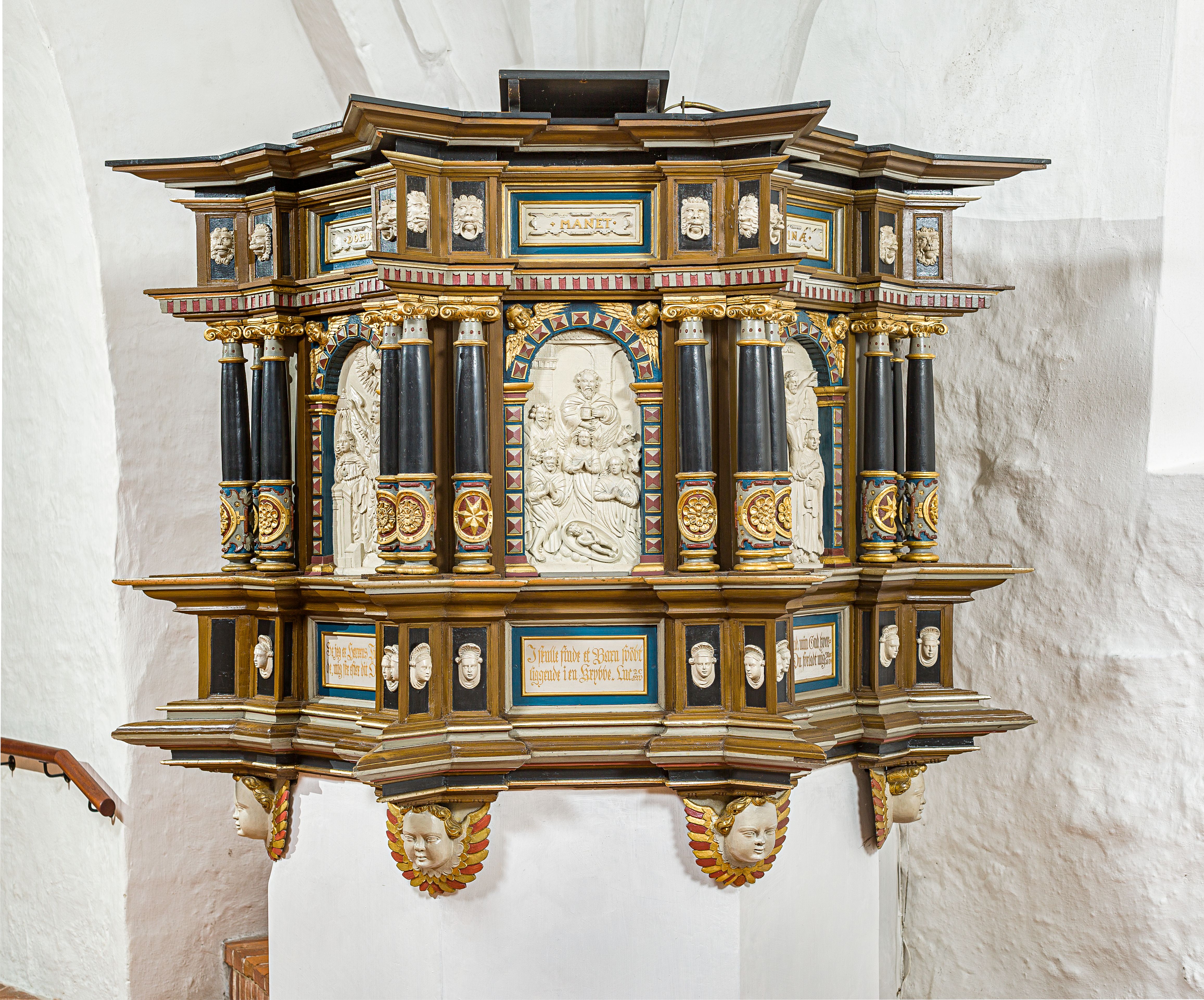Prædikestol, antagelig fra 1630'erne. Litteratur: Danmarks Kirker, Odense Amt, hft. 52-54, s. 6052, fig. 71.