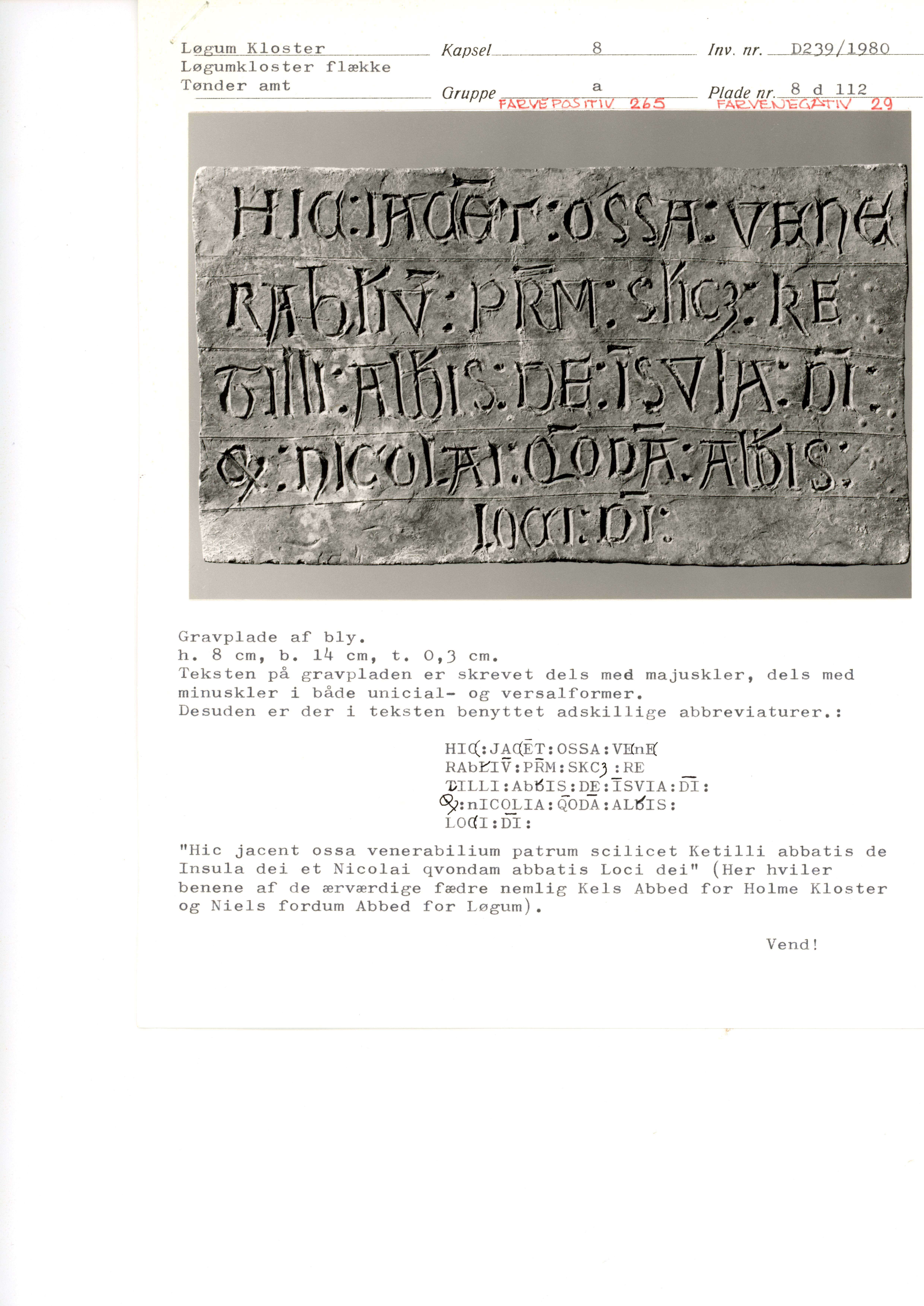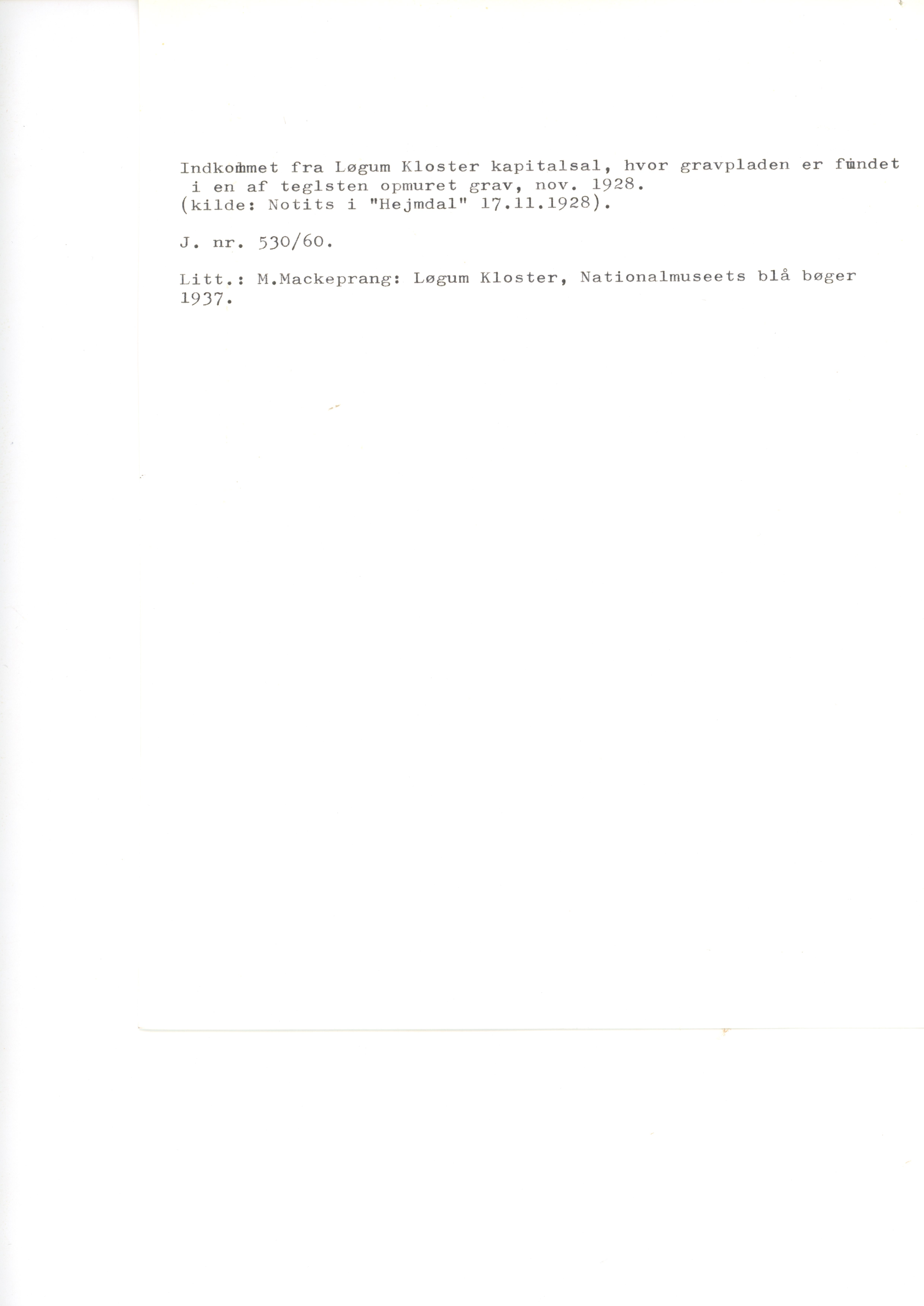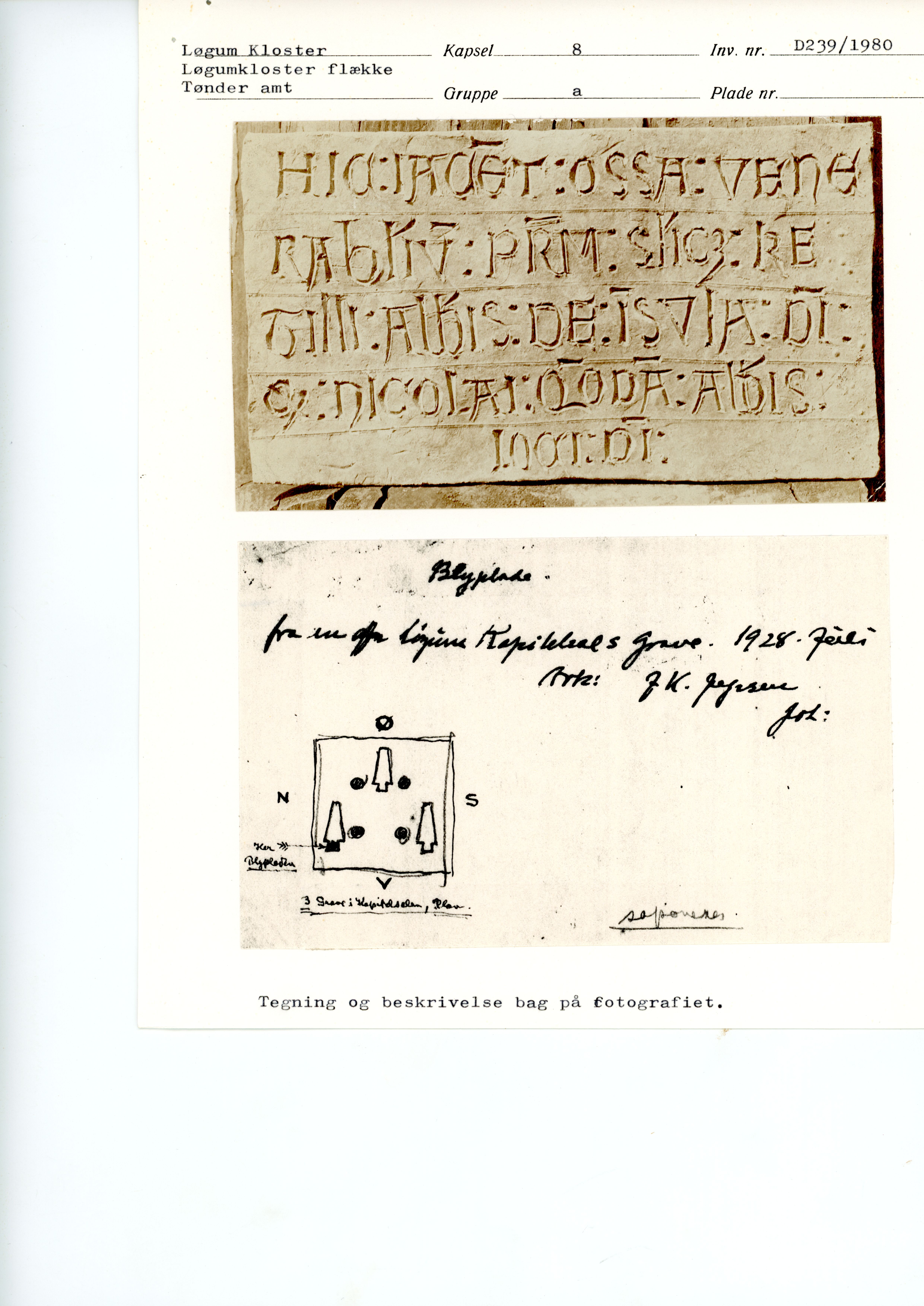 "angivelser": "FUNDET I EN AF TEGLSTEN MURET GRAV I KAPITELSALEN I LØGUMKLOSTER, NOV. 1928. - 210304"