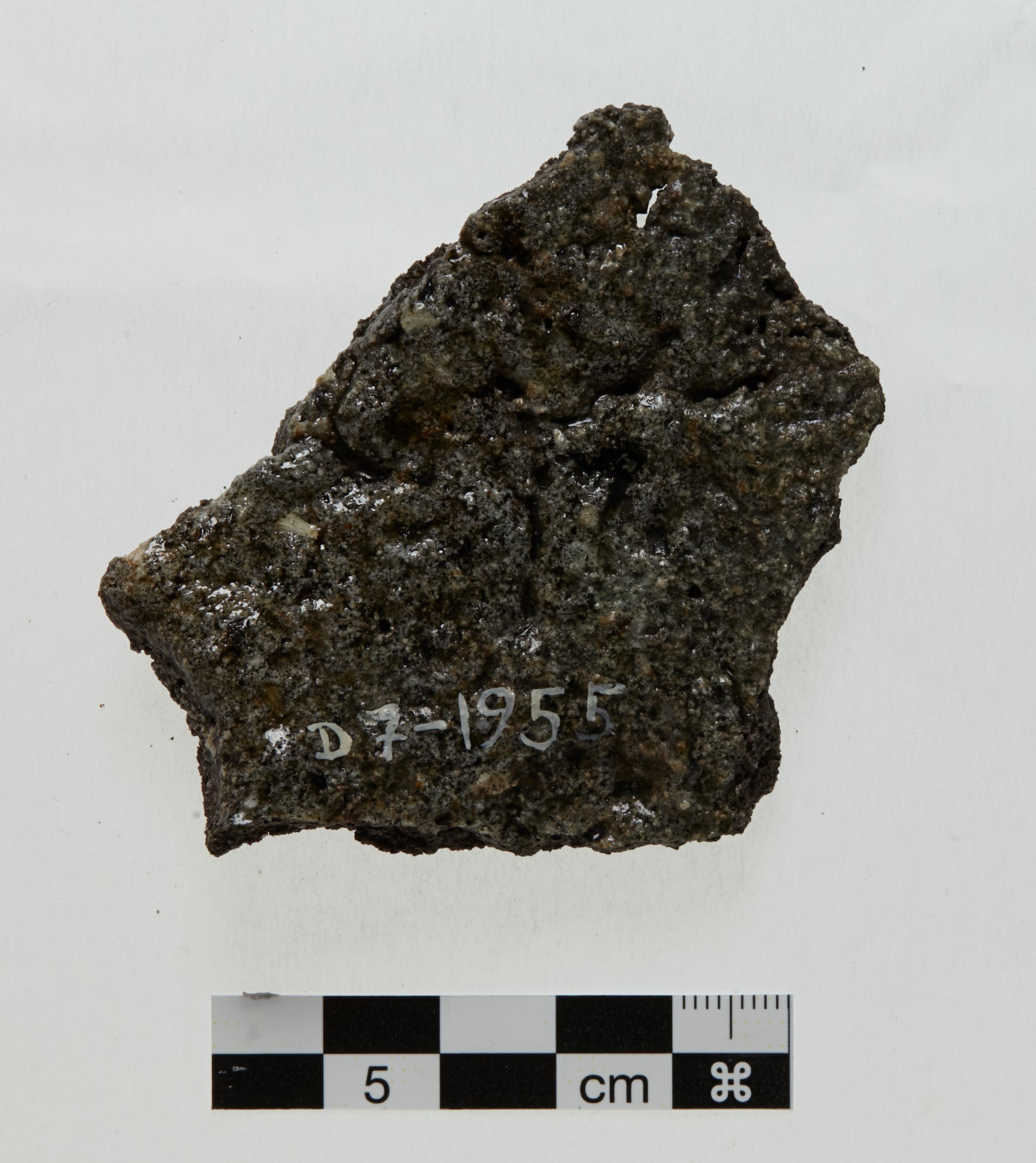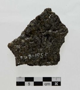 "Fragmentet, der har grøn glasur på den ene side, har været placeret i tilslutning til en rund åbning i diglen. Fundet ved harpning af fyldlag 1",