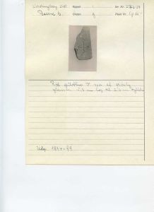 "Brudstykke af gulvflise af lysere, rød tegl. I oversiden er indridset et anker, i undersiden to mindre ditto. Spor af grøn glasur",