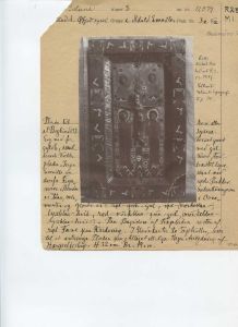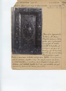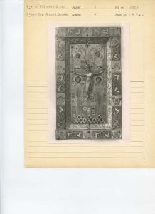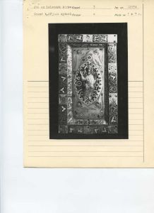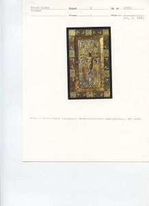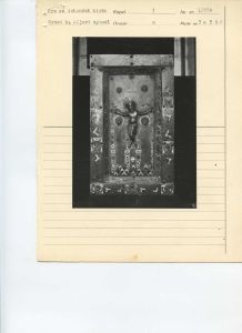 "Protokoltekst: To emaillerede Tavler, bestaaende af en Egetræs Bund, hvorpaa er anbragt emaillerede og forgyldte Kobberplader. På det ene fremstilles Christus på Korset og paa dettes øverste Deel: I H S med den velsignende Haand over. Forneden staae Maria og Johannes ved Korsets Sider og foroven ved det ere to Engle. Disse 4 Figurer have alle ophævede Hoveder der ere fastloddede paa Pladen. Paa den om den midterste Plade fremstaaende Kant sees 10 blaa Fiirkanter, hvori Brystbilleder af Engle, og derimellem ere Arabesker. - Paa den anden Tavle, hvis Rand er ligesom paa den først omtalte, sees paa den midterste Plade Christus siddende som Verdensdommer med Krone paa Hovedet, den højre Haand oprakt velsignende og i den venstre Haand, som er afbrudt, har han holdt Evangeliebogen. Omkring Christusfiguren er som sædvanligt Aureloen, og i de 4 Hjørner derom ere de 4 Evangelisters Symboler, alle med paaloddede, ophævede Hoveder. - Enhver af disse Tavler er 12 1/3 T. høi og 7 1/4 T. bred og paa Bagsiden er der Spor til, at de have været rødt malede. - Paa den underste Kant er der huller, hvori rimeligviis har passet Tapper, som have fastholdt dem til een eller anden Fjenstand, men hvad dette har været vides ikke. -",