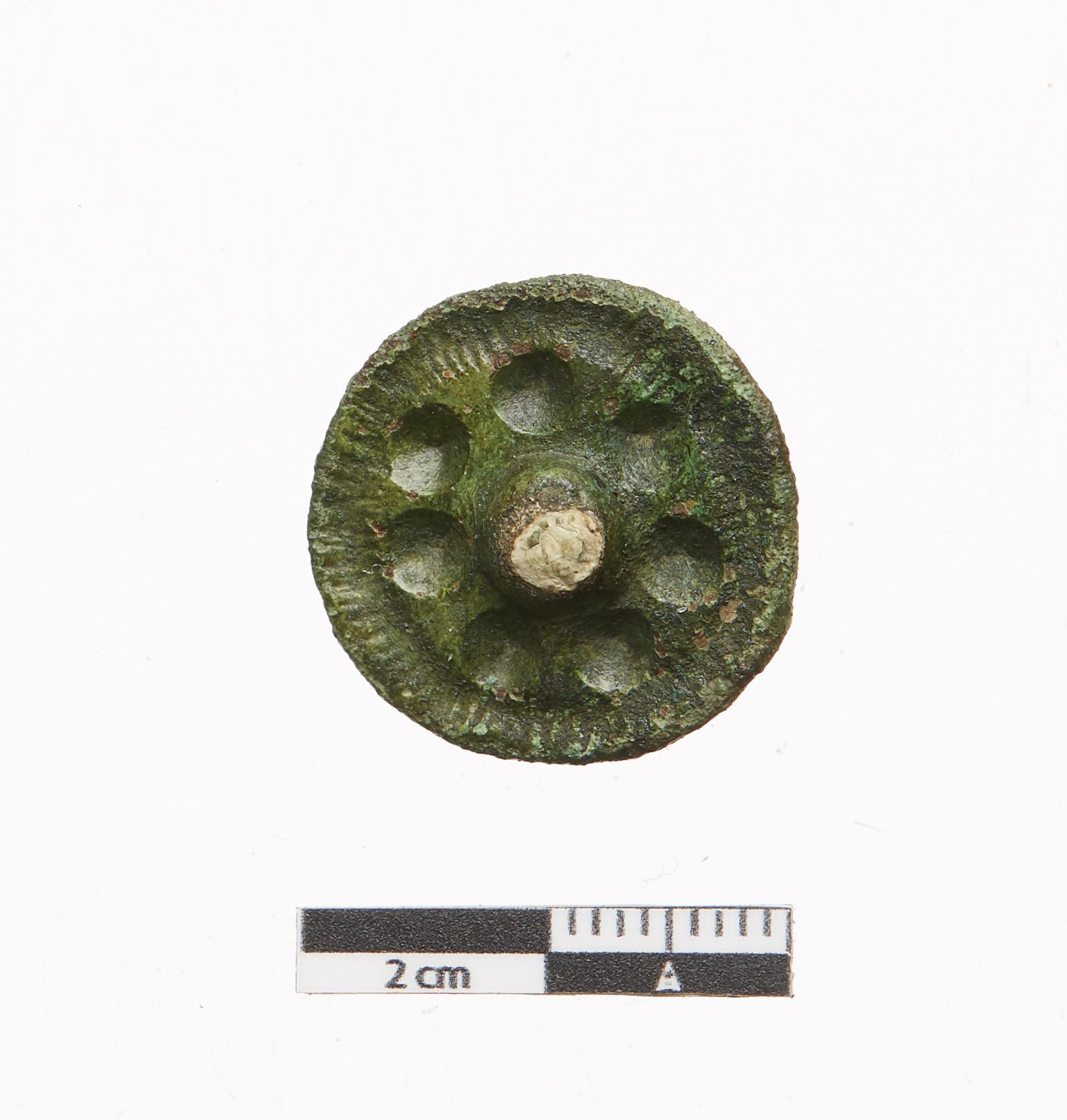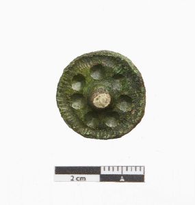 "Cirkulær fibula, nærmest hjulformet med central indfatning, hvori er rester af indlægningsmaterialet. Uden om indfatningen er syv cirkulære fordybninger. Randen er ornamenteret med tværstreger. På bagsiden ses en nåleanordning bestående af to modstillede flige, hhv. nåleholder med rest af jernnål samt nålekrog."