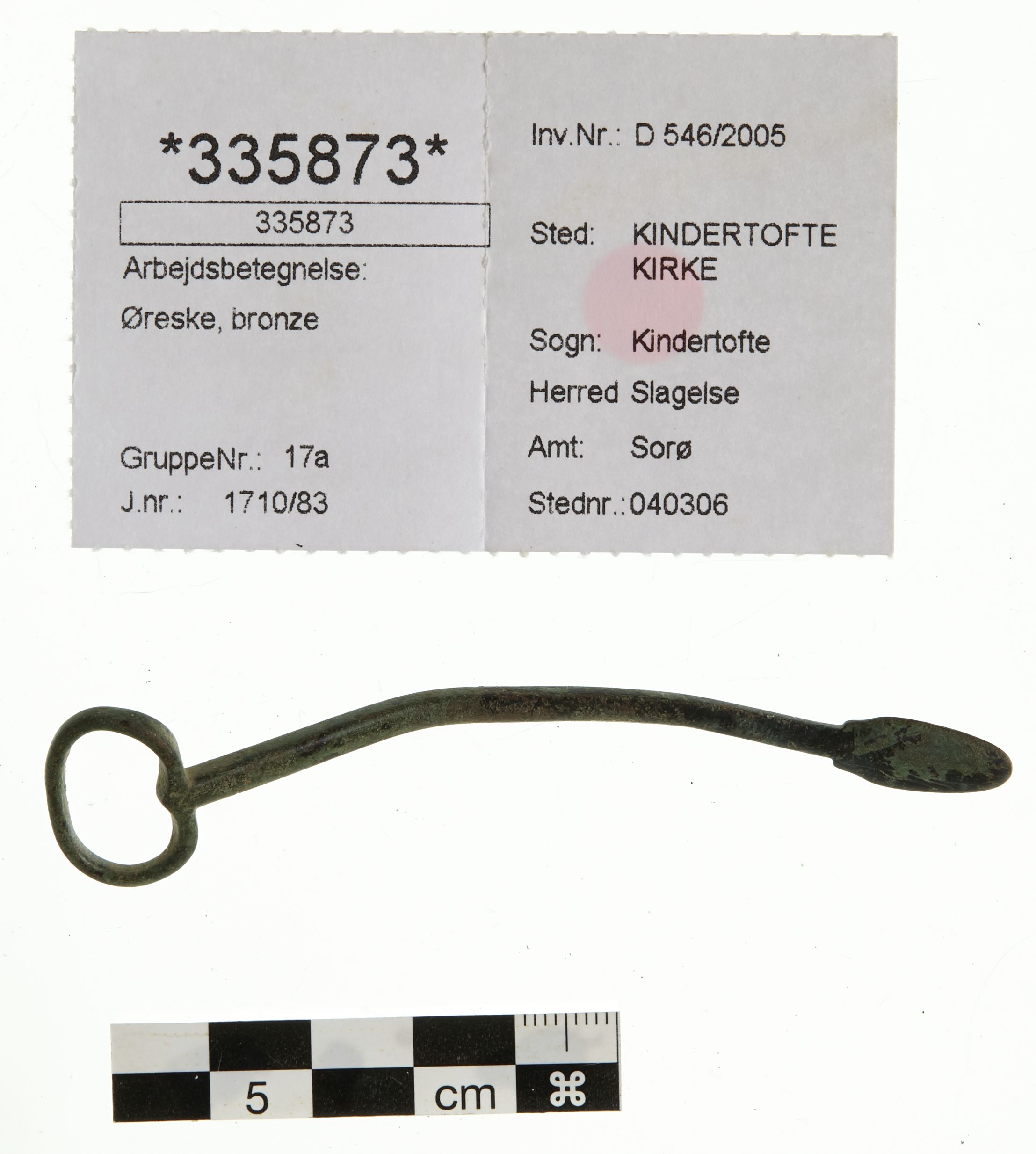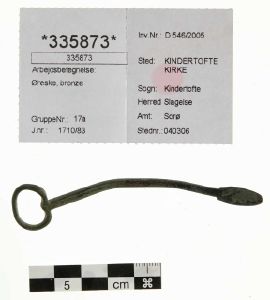 "Øreske, intakt. Aflangt, let hulet blad på et cirkulært skaft. Afsluttes med halvcirkulær ring øverst"