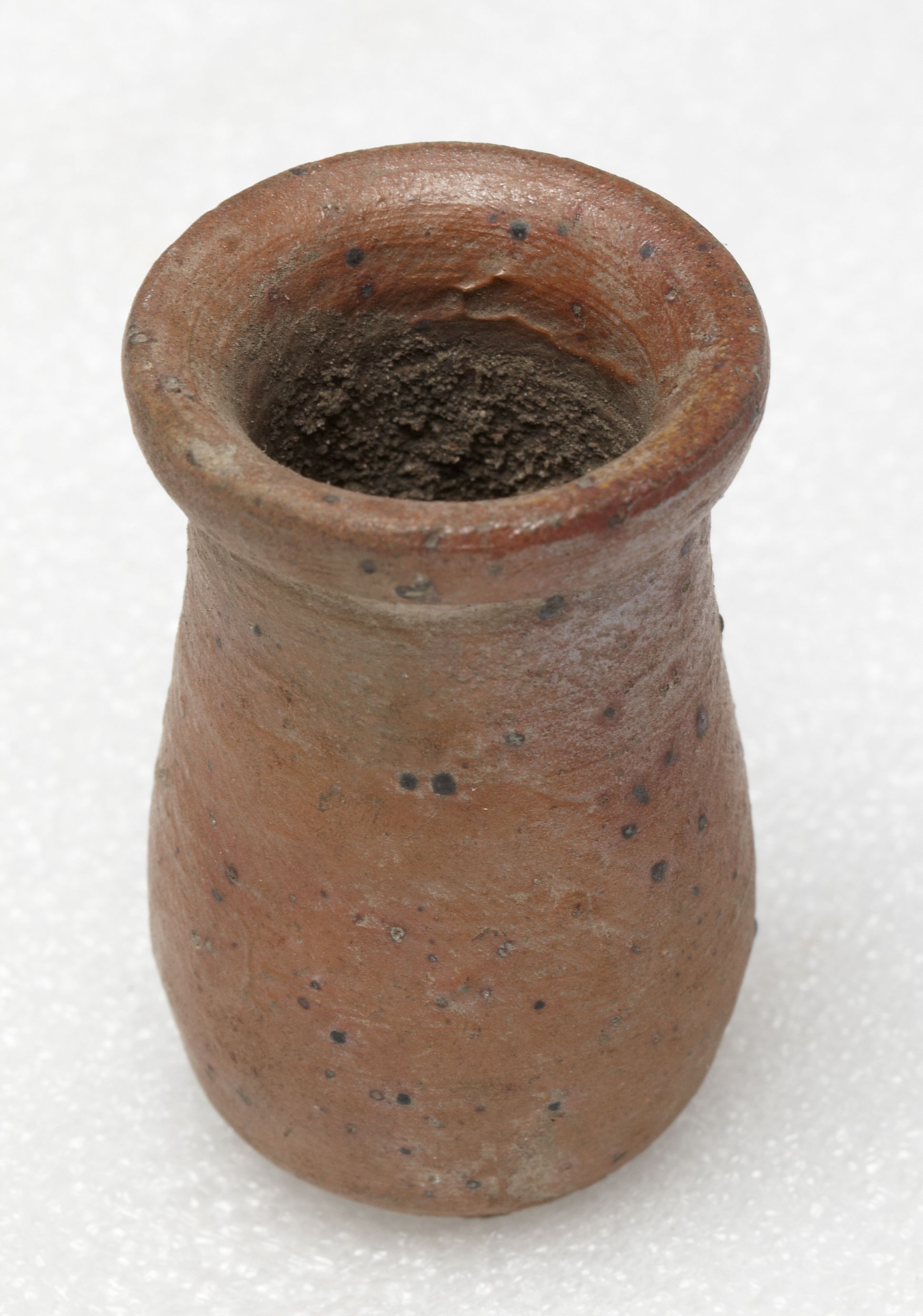 "Lille hel salvekrukke af stentøj med brunlig glasur"