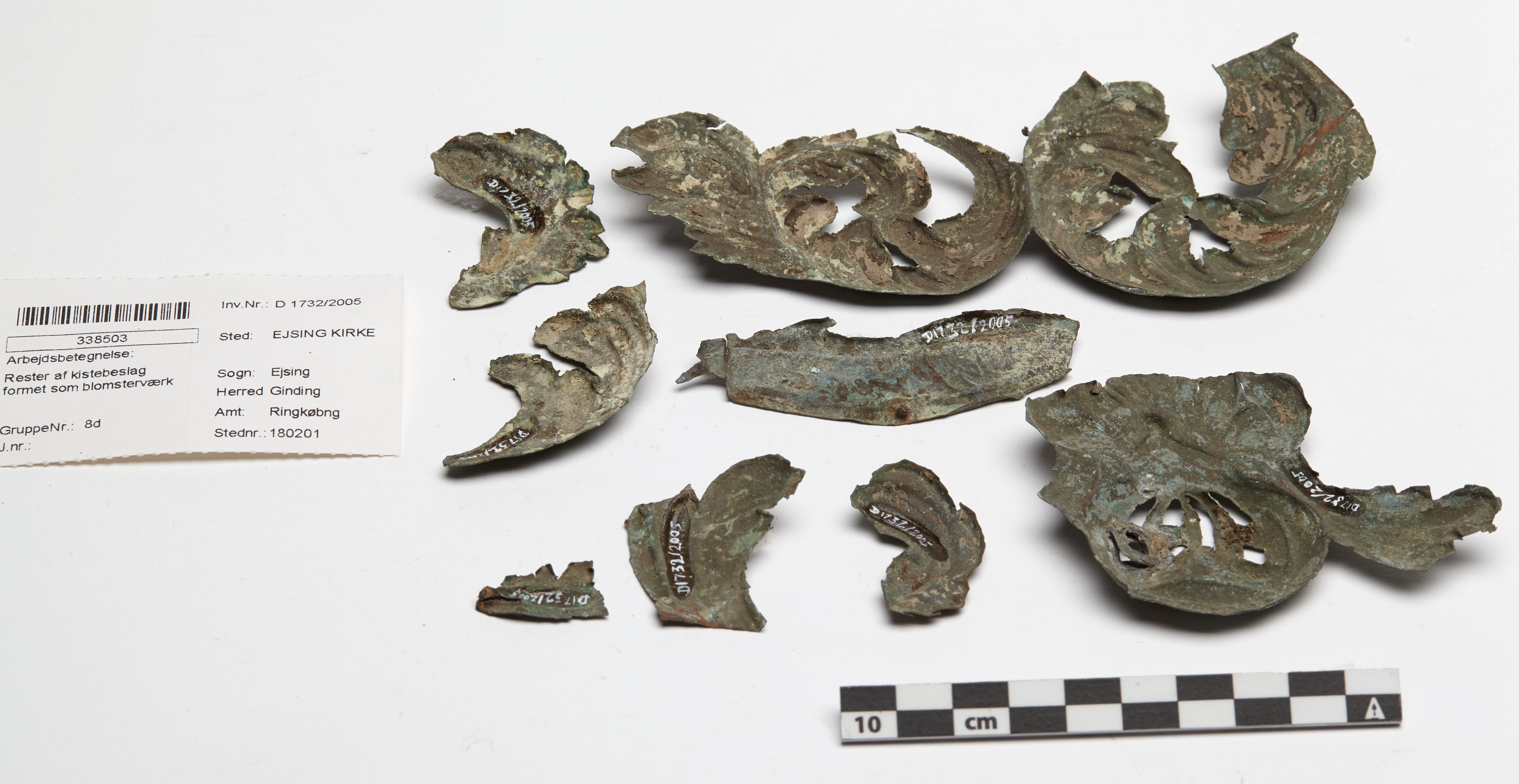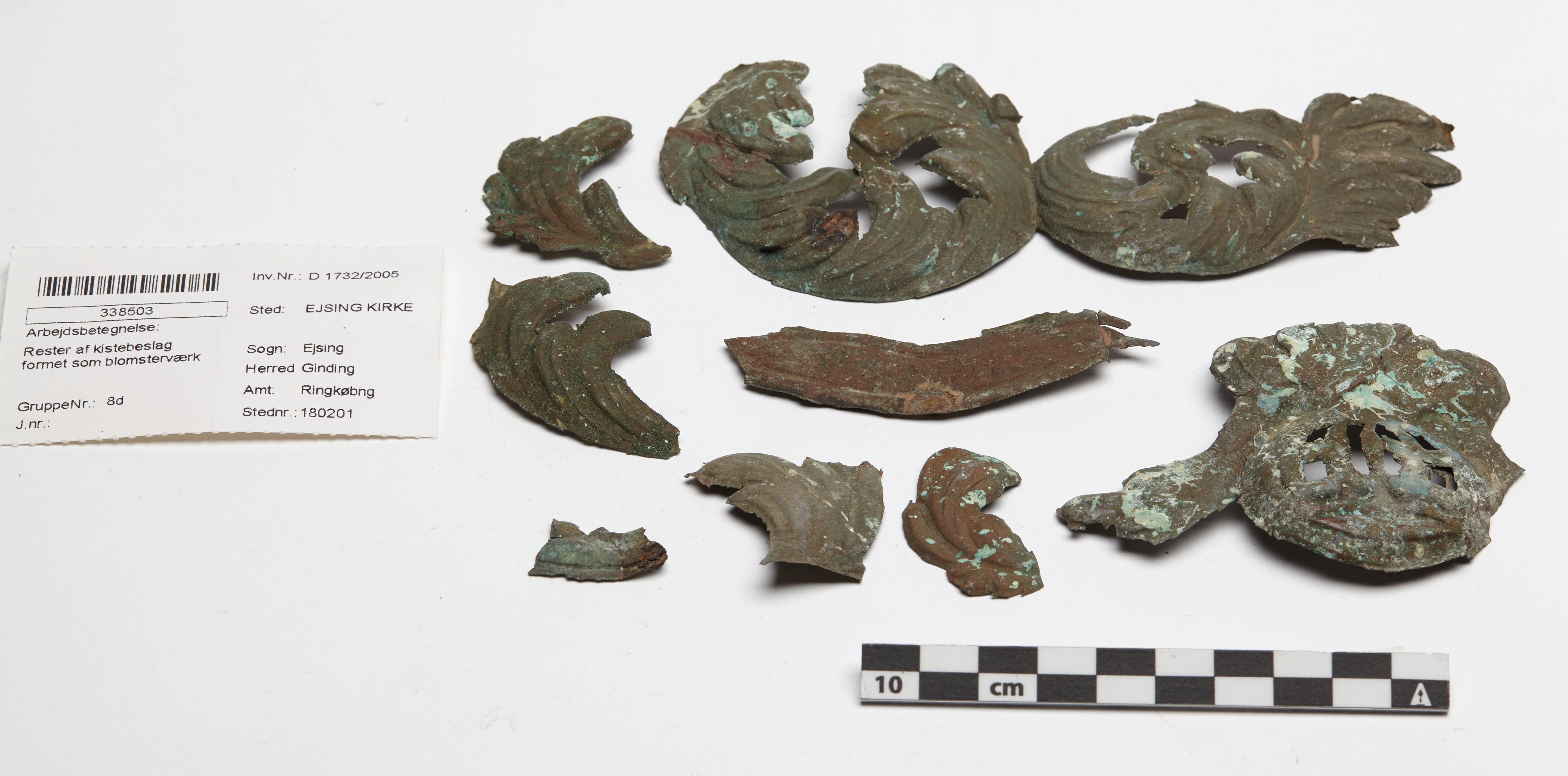"betegnelse": "Rester af kistebeslag formet som blomsterværk",