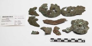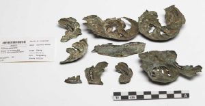 "Rester af kistebeslag udformet som hhv. blomsterværk, en hjælm og et ulæseligt navn skrevet på en skilt."