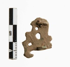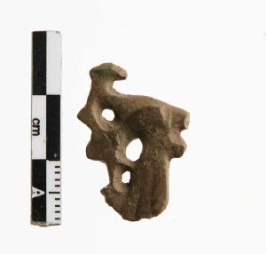 "Fugleformet fibula i gennembrudt arbejde. Fuglen ser mod højre. Rester af nåleholder og -fæste. I sidstnævnte rester af en lille tynd nål af bronze.",