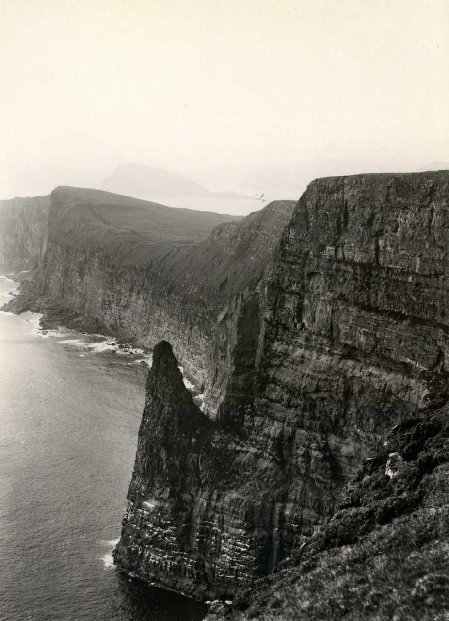 Fuglebjerge på vestkysten af Sandø, set mod nord. I baggrunden skimtes Koltur. I forgrunden klippen Kirkjan, hvor fuglenes tilholdssteder tegner sig som vandrette, hvide striber. Foto: Generalstaben Topografiske afdeling 1890erne.