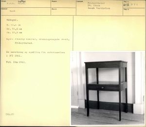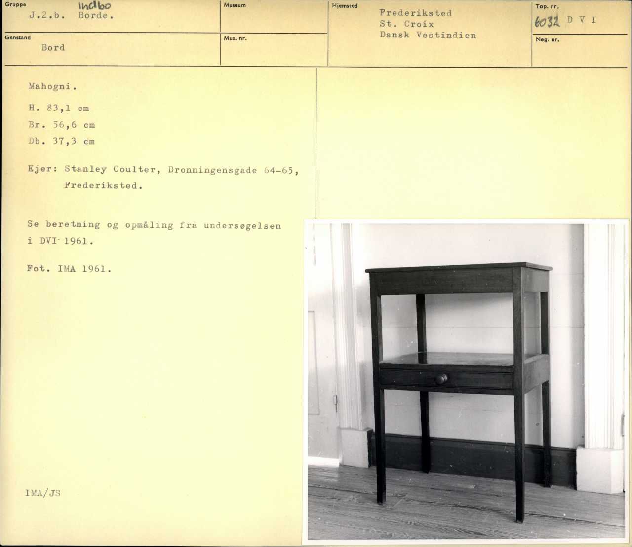 Bord af mahogni. Højde: 83,1 cm, bredde: 56,6 cm, dybde: 37,3 cm. Ejer: Stanley Coulter. Se beretning og opmåling fra undersøgelsen i DVI 1961. Beskrevet af Inge Mejer Antonsen. Foto: Inge Mejer Antonsen, 1961.