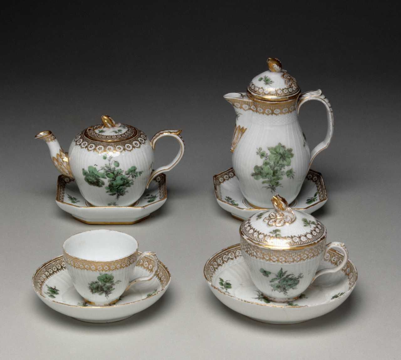 Testellet er bestilt af generalpostdirektør J.T. Holmskjold i 1790'erne. Foruden postvæsenet var han også tilknyttet fabrikken som bestyrer i 1786-1793. I tekanden var den stærke te, i den høje mælkekande var mælk. Låget på koppen kunne sikre en lang tids passiar over tebordet, og underfadene skærmede bordene i ædelt træ.