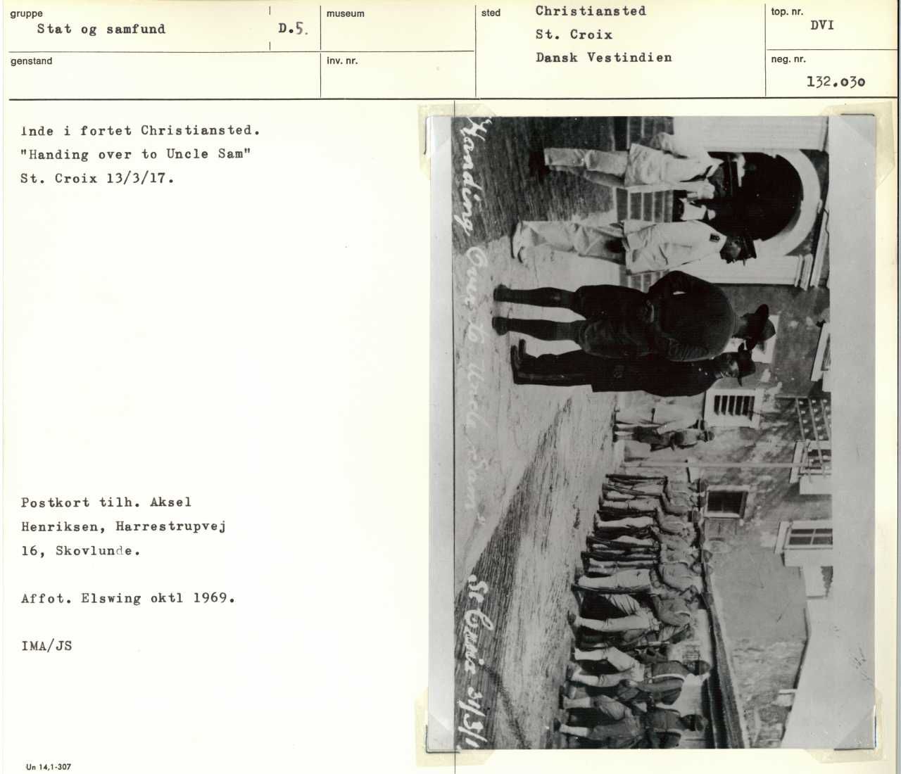 Inde i fortet i Christiansted. "Handing over to Uncle Sam Skt. Croix 31/3/17". Postkort tilhører Aksel Henriksen. Beskrevet af Inge Mejer Antonsen. Affotograferet af Niels Elswing i oktober 1969.