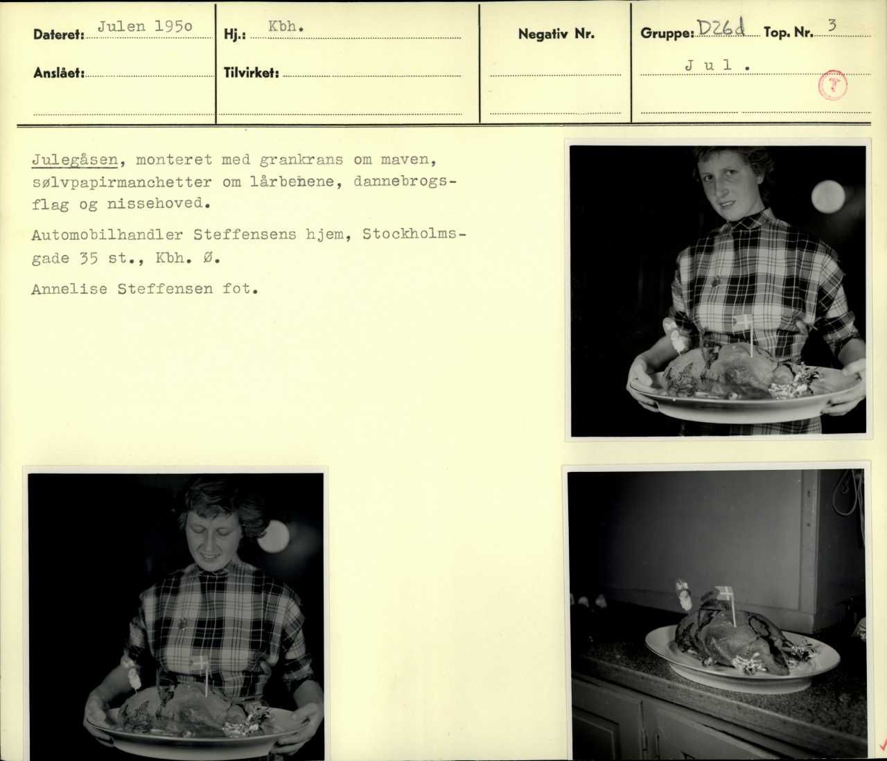 Julegåsen, monteret med grankrans om maven, sølvpapirmanchetter om lårbenene, dannebrogsflag og nissehoved. Automobilhandler Steffensens hjem.