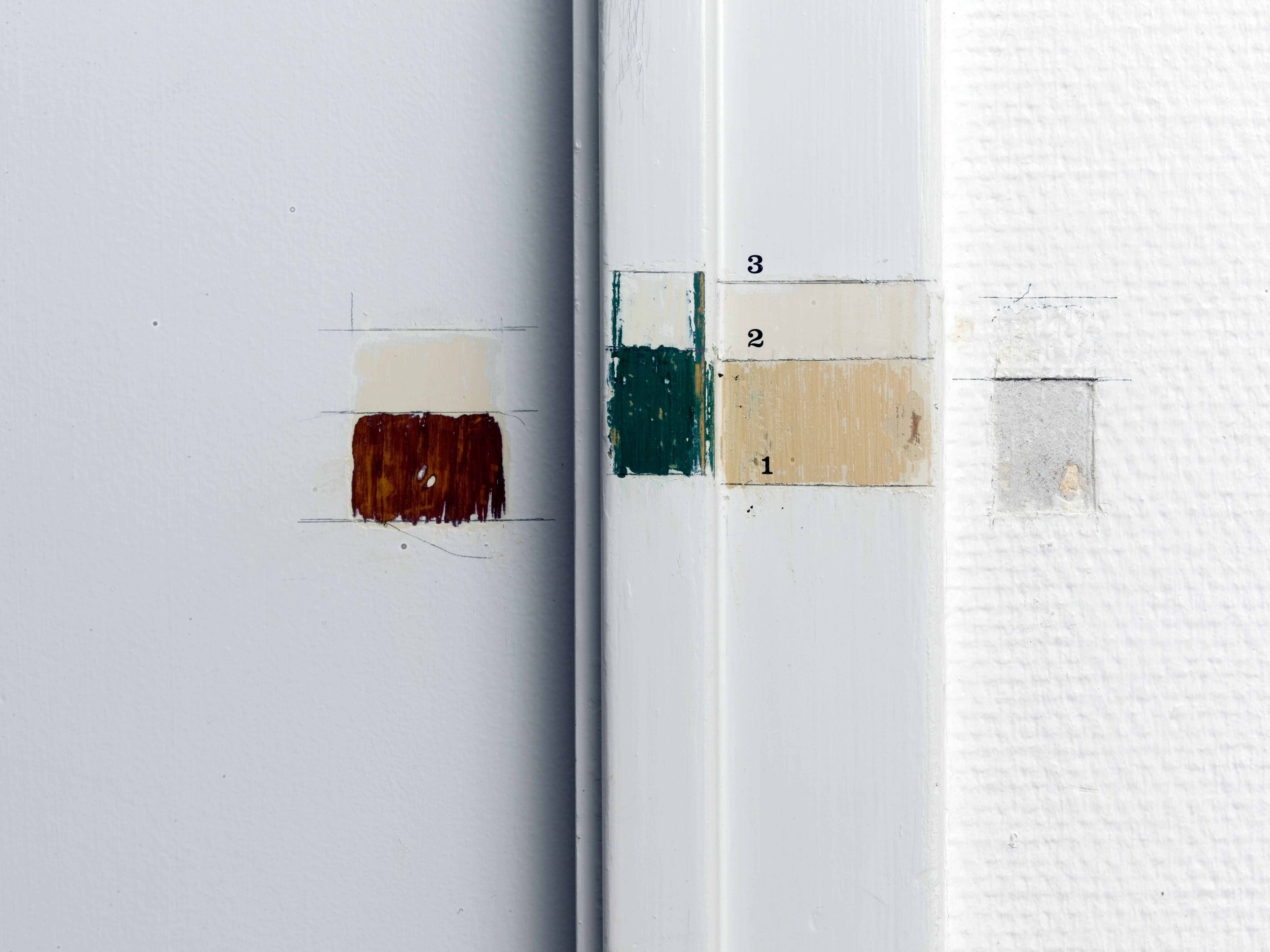 Enfamiliehus, Bloksbjerget 12, Klampenborg, opført 1935 af arkitekt Frits Schlegel for ingeniør Viggo Sthyr. Afdækning af det første, grønne farvelag på dørindfatningens karm og det første, beige farvelag (lag 1) på indfatningens ydre led samt afdækning af den oprindelige naturtræsdør. Desuden afdækning af det første, grå farvelag på væg. Gang i nedre etage.