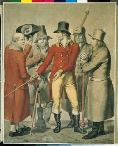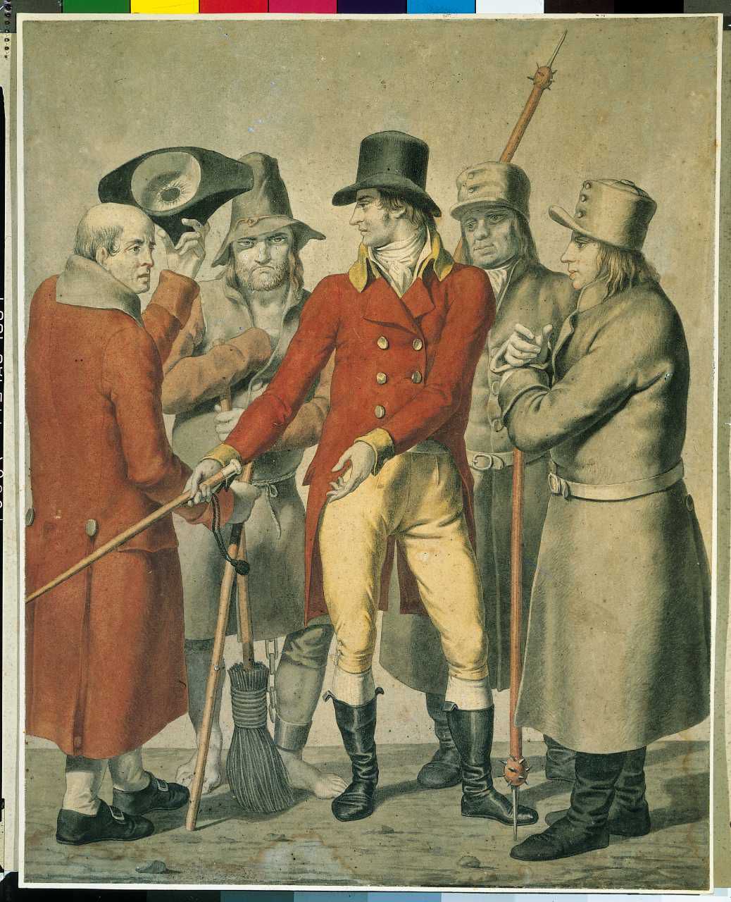 En politibetjent og to vægtere. Kobberstik af J Senn, omkring 1800