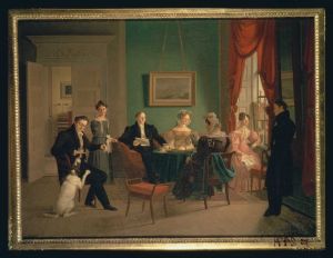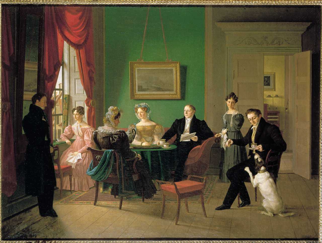 Konferenceråd Gerhard Christopher Schram og hans familie i hjemmet, Nørregade 5. "Det Schramske familiebillede", oliemaleri af Emilius Bærentzen, 1829. Signeret: B. 1829 (Emilius Bærentzen 1799-1868).