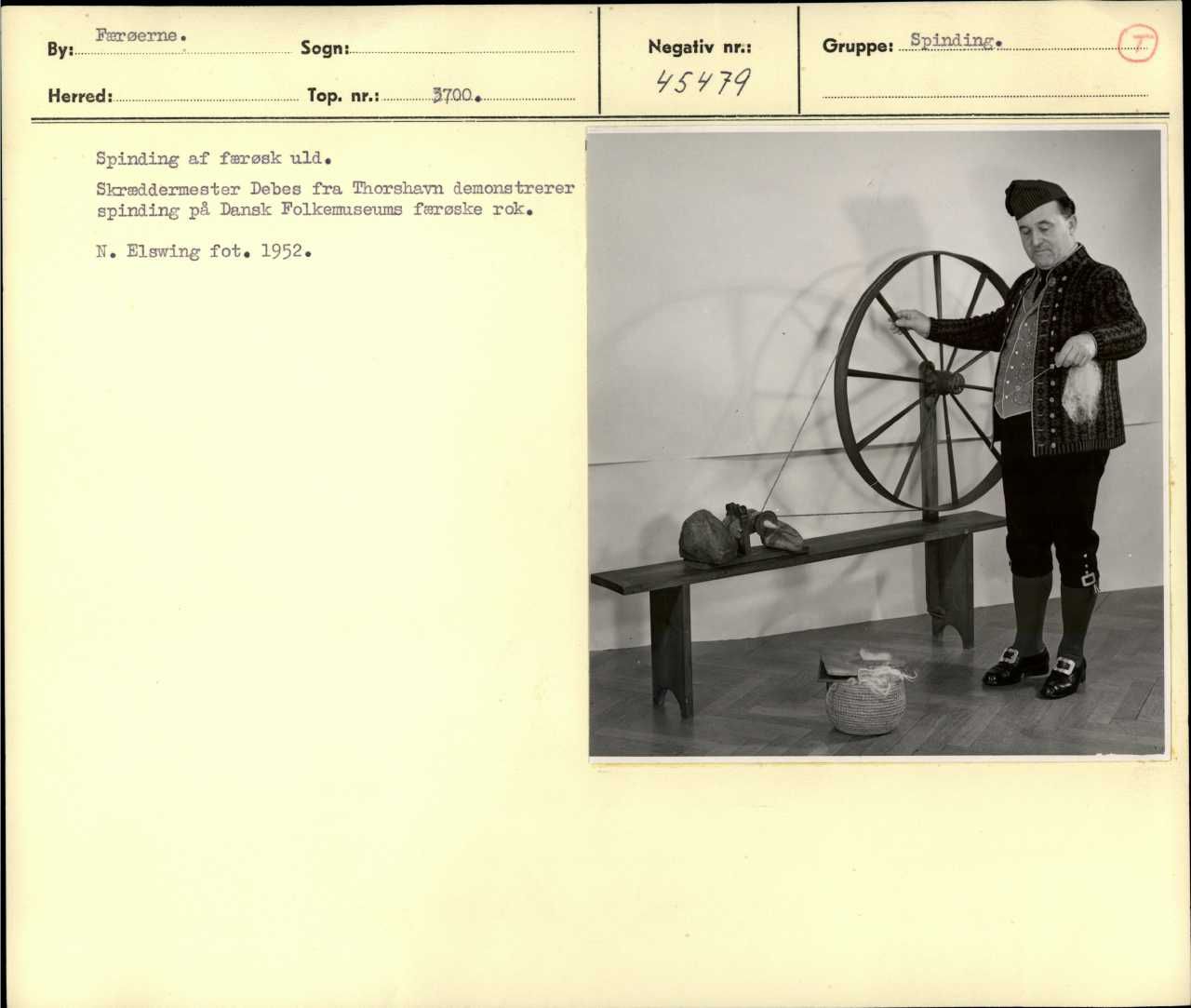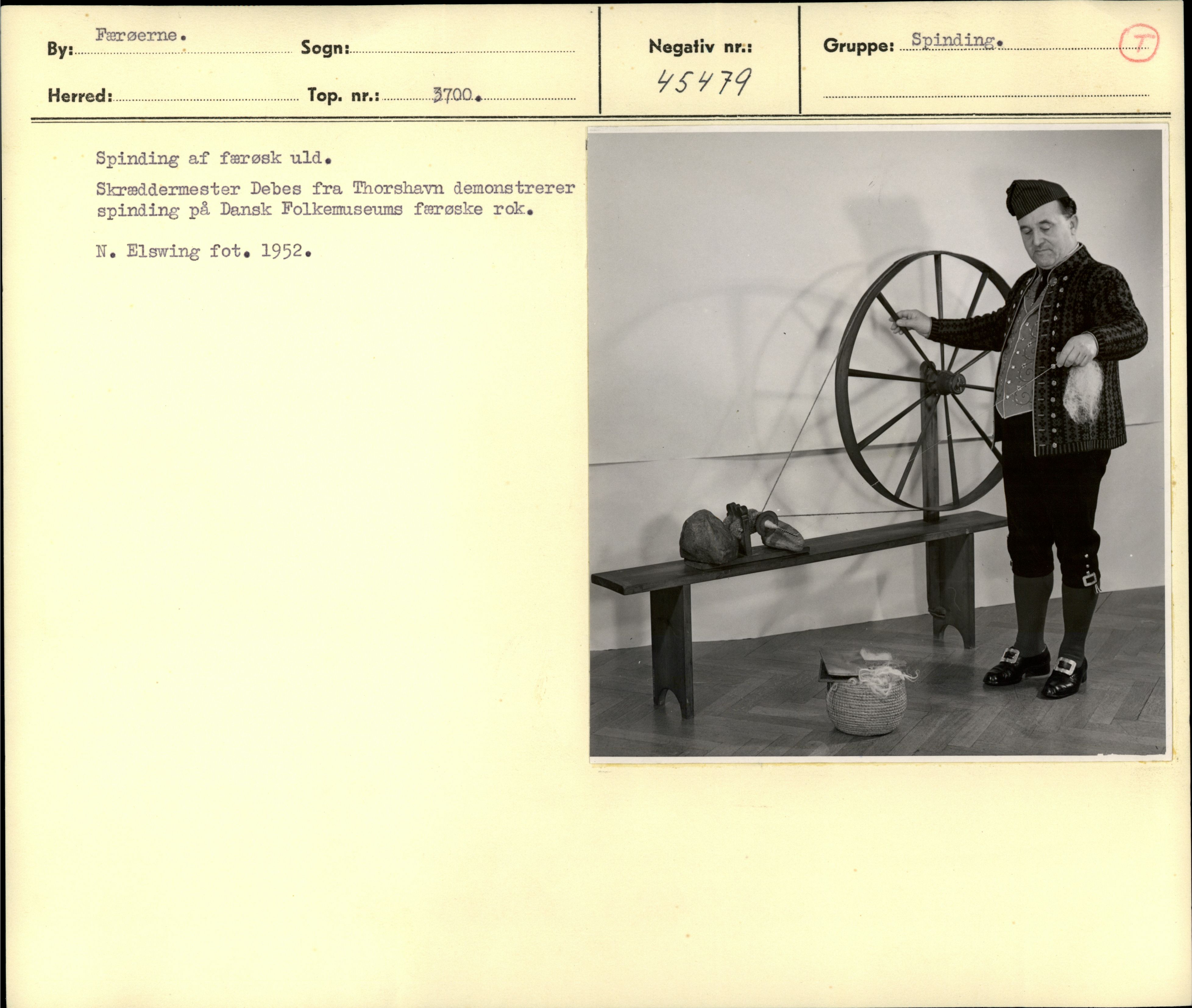 Spinding af færøsk uld. Skræddermester Debes fra Thorshavn demonstrerer spinding på Dansk Folkemuseums færøske rok. Foto: Niels Elswing 1952.