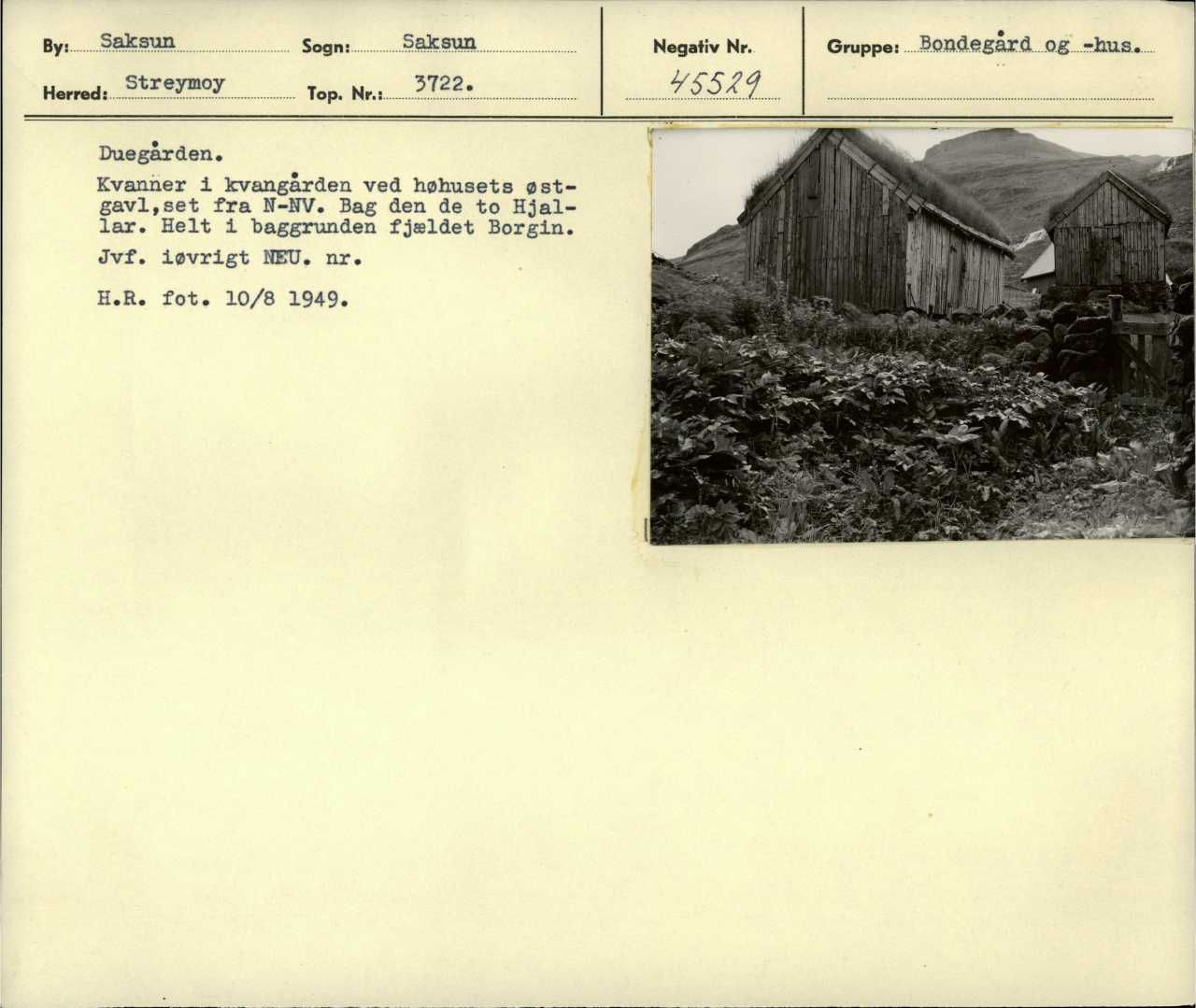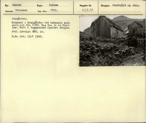 Duegården i Saksen. Kvanner i kvangården ved høhusets østgavl, set fra nord-nordvest. Bag den de to Hjallar (tørrehuse). Helt i baggrunden fjeldet Borgin. Jævnfør iøvrigt NEU-nummer. Foto: Holger Rasmussen 10. august 1949.