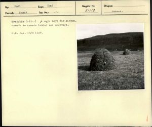 Høstakke (sátur) på agre nord for kirken. Bemærk de snoede høbånd med stenvægt. Foto: Holger Rasmussen 10. september 1947.
