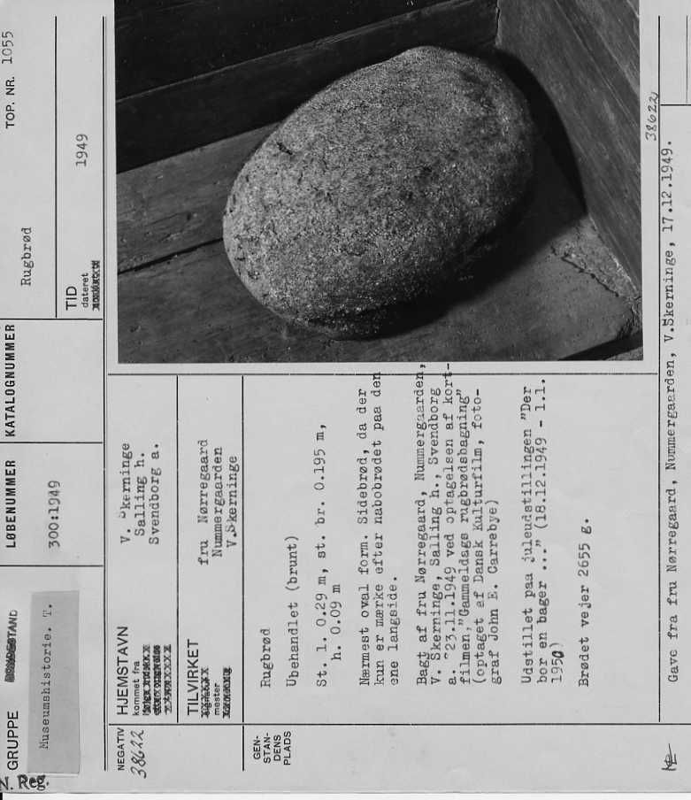 Rugbrød. Ubehandlet (brunt). Størrelse: længde 0.29 m. bredde 0,195 m. højde 0,09 m. Nærmest oval form. Sidebrød, da der kun er mærke efter nabobrødet på den ene langside. Bagt af fru Nørregaard, Nummergaarden, V. Skerninge, Salling herred, Svendborg amt. 23. november 1949 ved optagelsen af kortfilmen "Gammeldags rugbrødsbagning" (optaget af Dansk Kulturfilm, fotograf John E. Carrebye). Udstillet på juleudstillingen "Der bor en bager..." (18. december 1949 - 1. januar 1950). Brødet vejer 2655 gram.
