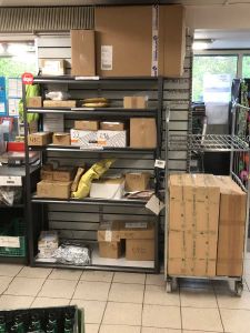 Pakker fra forskellige udbringningsformaer venter på afhentning i Lokal Brugsen, Helgenæs. maj 2020.