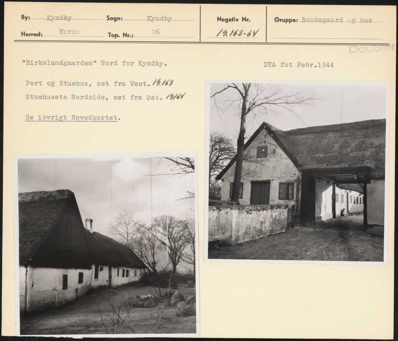 Maskingenkendt tekst fra arkivkort. Birkelundgaarden" Nord for Kyndby. DYA fot Febr.1944 Port og Stuehus, set fra Vest/b/62 Stuehusets Nordside, set fra Øst/Ø/éY Se iøvrigt Hovedkortet.