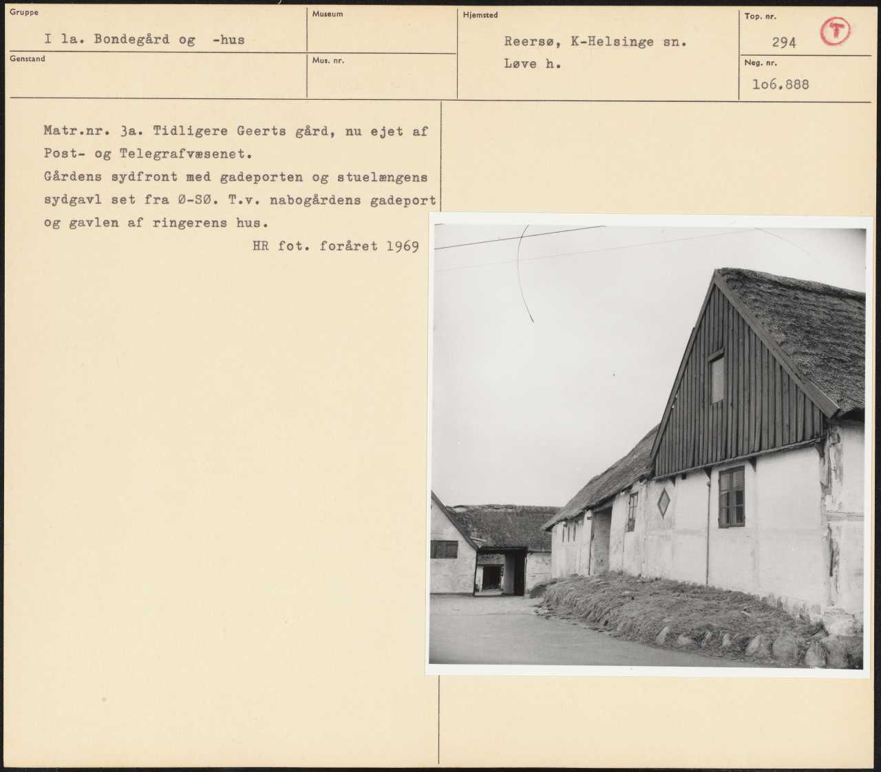 Maskingenkendt tekst fra arkivkort. Matr.nr. 3a. Tidligere Geerts gård, nu ejet af Post- og Telegrafvæsenet. Gårdens sydfront med gadeporten og stuelængens sydgavl set fra Ø-SØ. T.v. nabogårdens gadeport og gavlen af ringerens hus. HR fot. foråret 1969