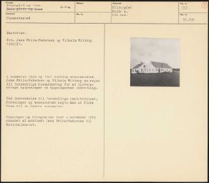 Maskingenkendt tekst fra arkivkort. Eksteriør. Fot. Jens Friis-Pedersen og Vilhelm Wittrup 1920/21. I sommeren 1920 og 1921 foretog arkitekterne Jens Friis-Pedersen og Vilhelm Wittrup en rejse til forskellige husmandsbrug for at tilveje- bringe oplysninger om bygningernes indretning. Ved henvendelse til forskellige institutioner, foreninger og konsulenter søgte man at finde frem til de bedste eksempler. Tegninger og fotografier blev i november 1965 skænket af arkitekt Jens Friis-Pedersen til Nationalmuscet.
