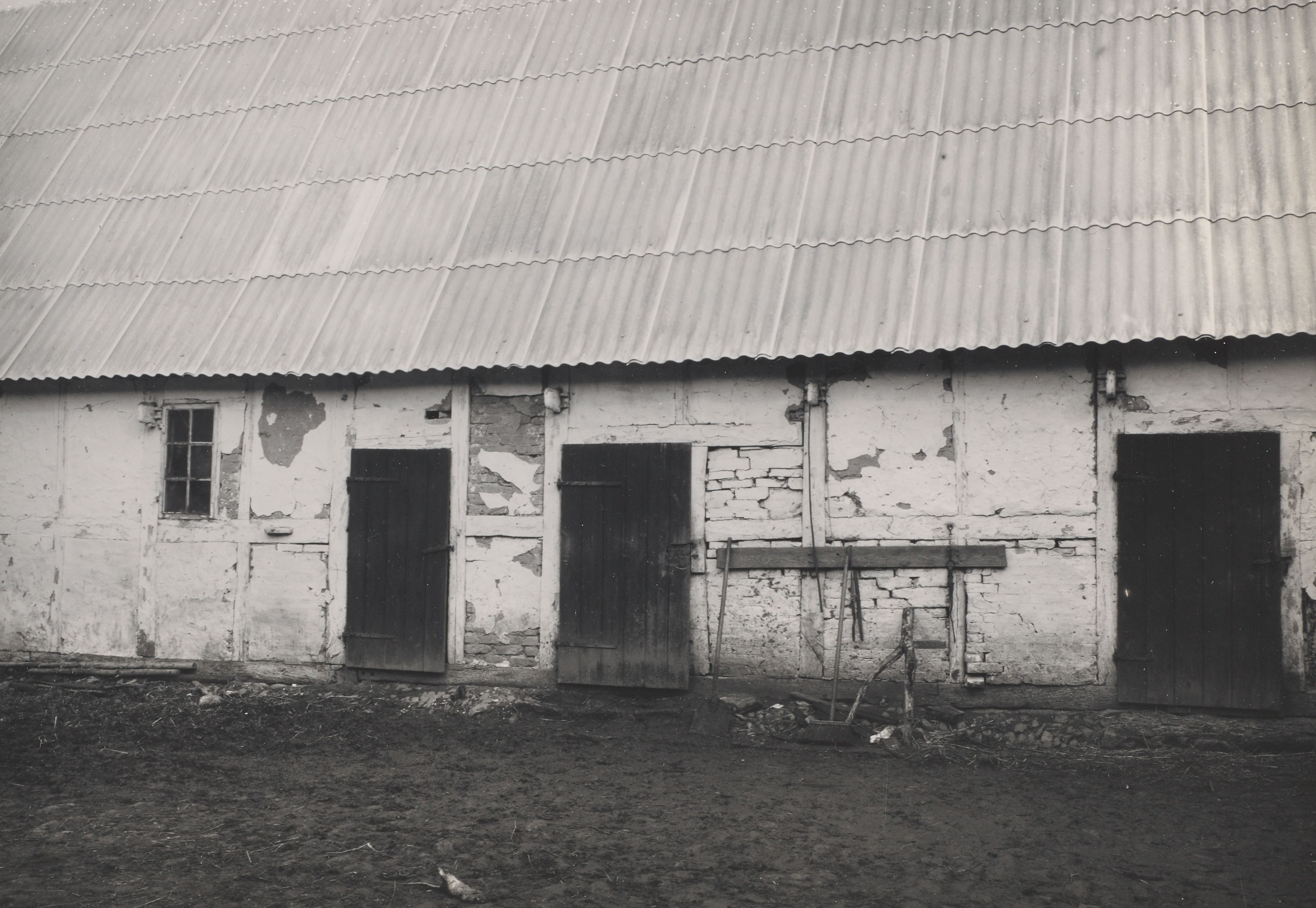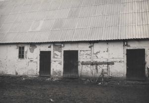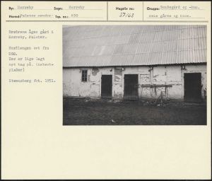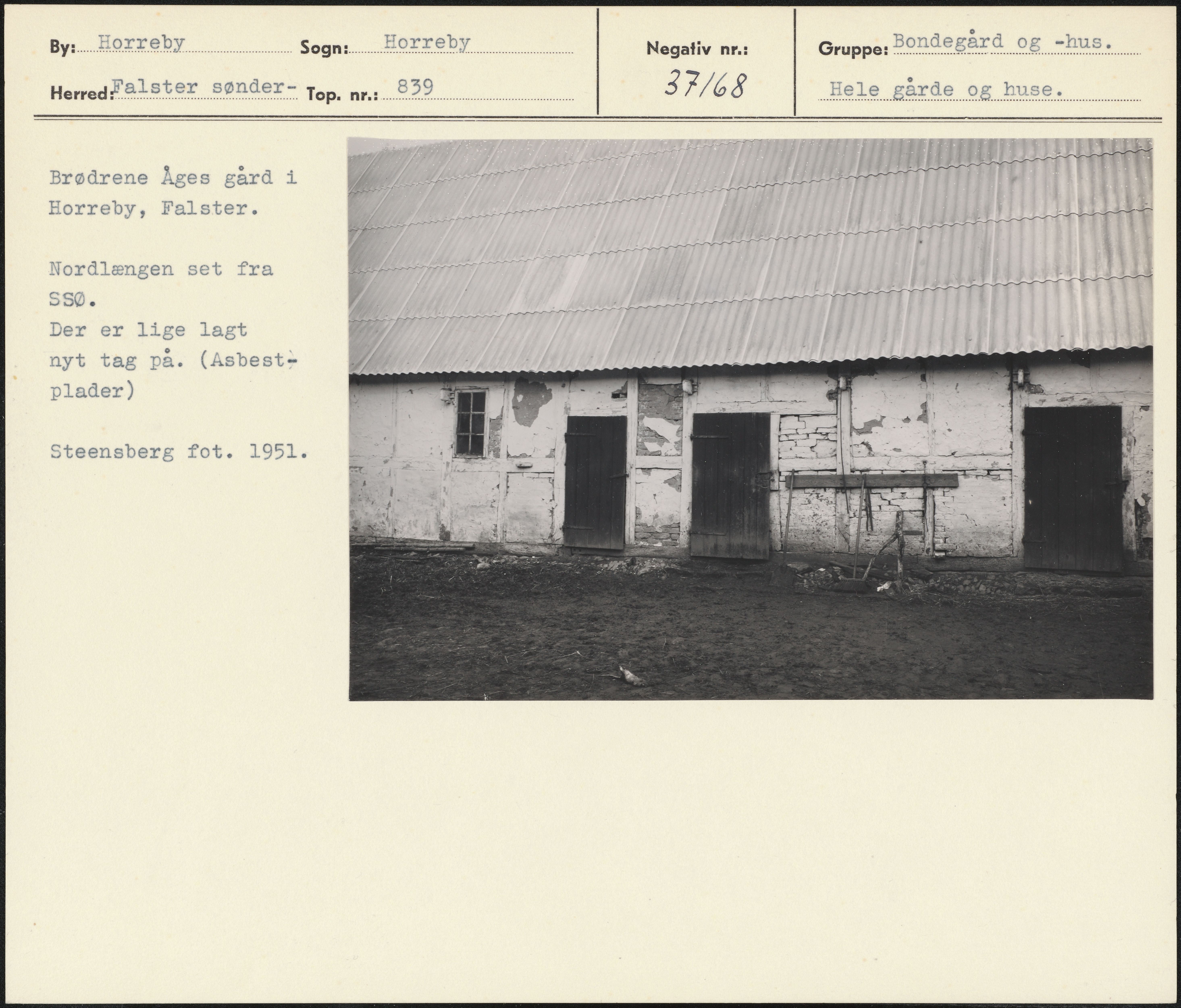 Maskingenkendt tekst fra arkivkort. Brødrene Åges gård i Horreby, Falster. Nordlængen set fra S50Ø. Der er lige lagt nyt tag på(Asbest- plader) Steensberg fot. 1951.