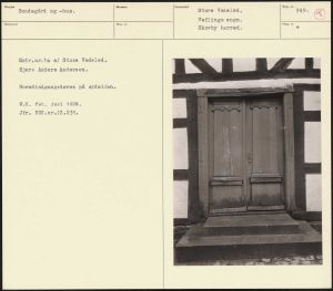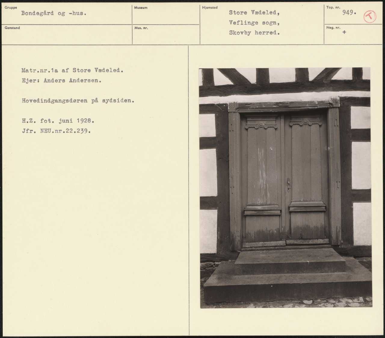 Maskingenkendt tekst fra arkivkort. Matr.nr.1a af Store Vædeled. Ejer: Anders Andersen. Hovedindgangsdøren på sydsiden. H.Z. fot. juni 1928. Jfr. NEU.nr.22.239.