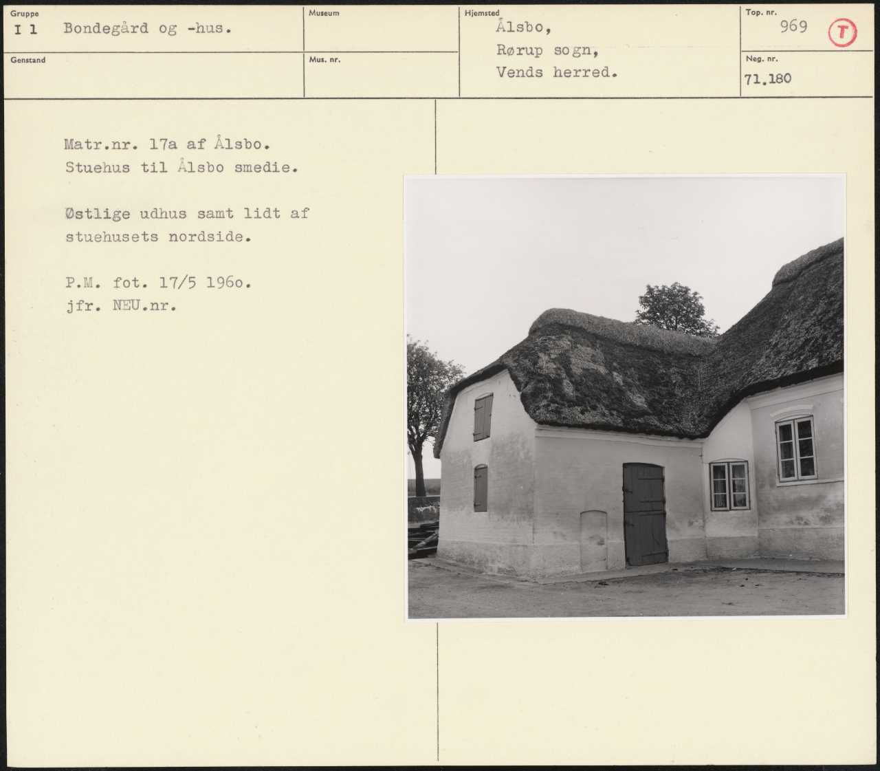 Maskingenkendt tekst fra arkivkort. Matr.nr. 17a af Ålsbo. Stuehus til Ålsbo smedie. Østlige udhus samt lidt af stuehusets nordside. P.M. fot. 17/5 1960. jfr. NEU.nr.
