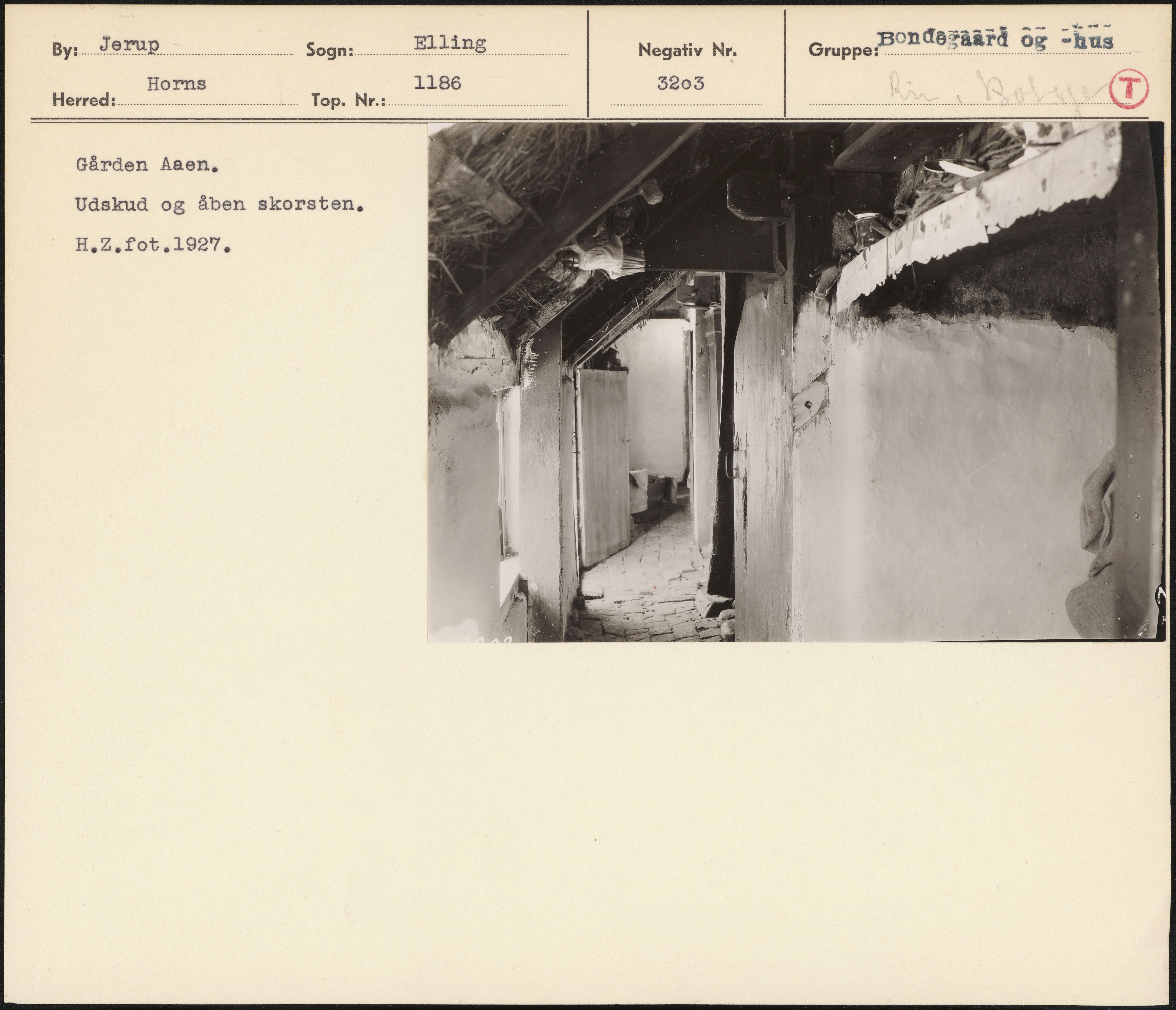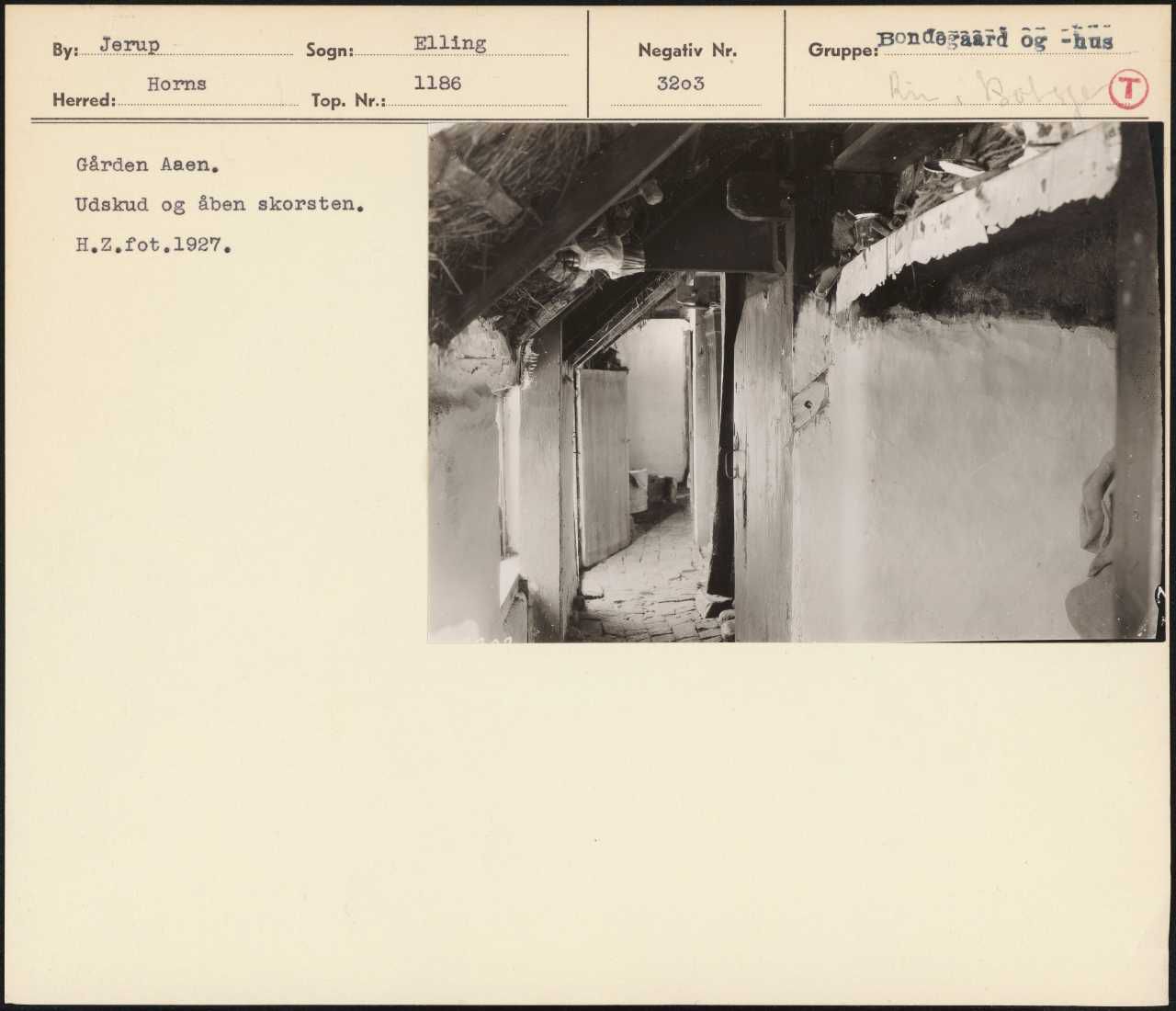 Maskingenkendt tekst fra arkivkort. Gården Aaen, Udskud og åben skorsten. H.Z.fot.1927.