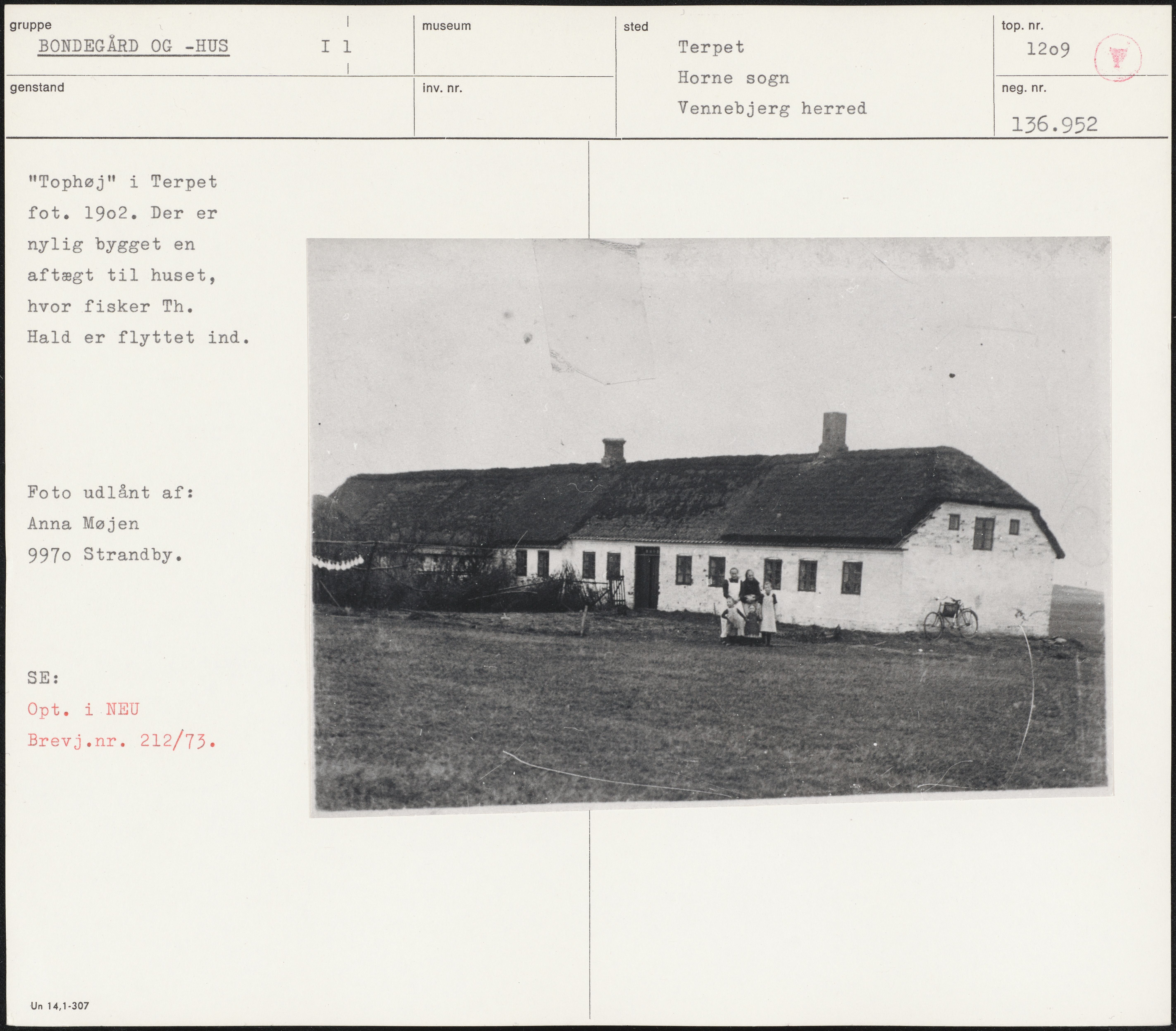 Maskingenkendt tekst fra arkivkort. Tophøj" i Terpet fot. 1902. Der er nylig bygget en aftægt til huset, hvor fisker Th. Hald er flyttet ind. Foto udlånt af: Anna Møjen 9970 Strandby. SE: Opt. i NEU Brevj.nr. 212/73. Un 14,1-307