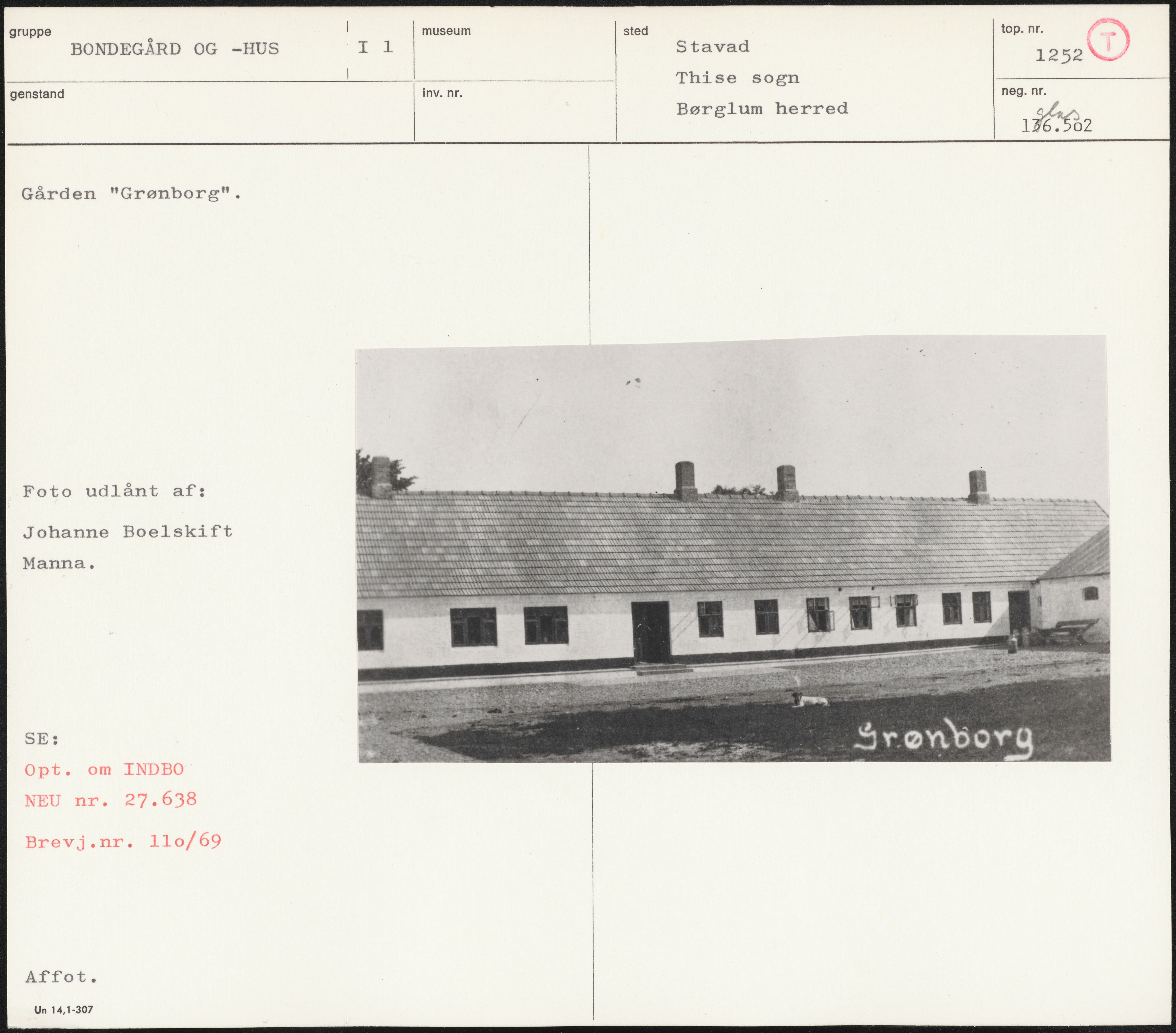 Maskingenkendt tekst fra arkivkort. Gården "Grønborg". Foto udlånt af: Johanne Boelskift Manna. SE: Opt. om INDBO NEU nr. 27.638 Brevj.nr. 110/69 Affot. Un 14,1-307