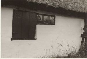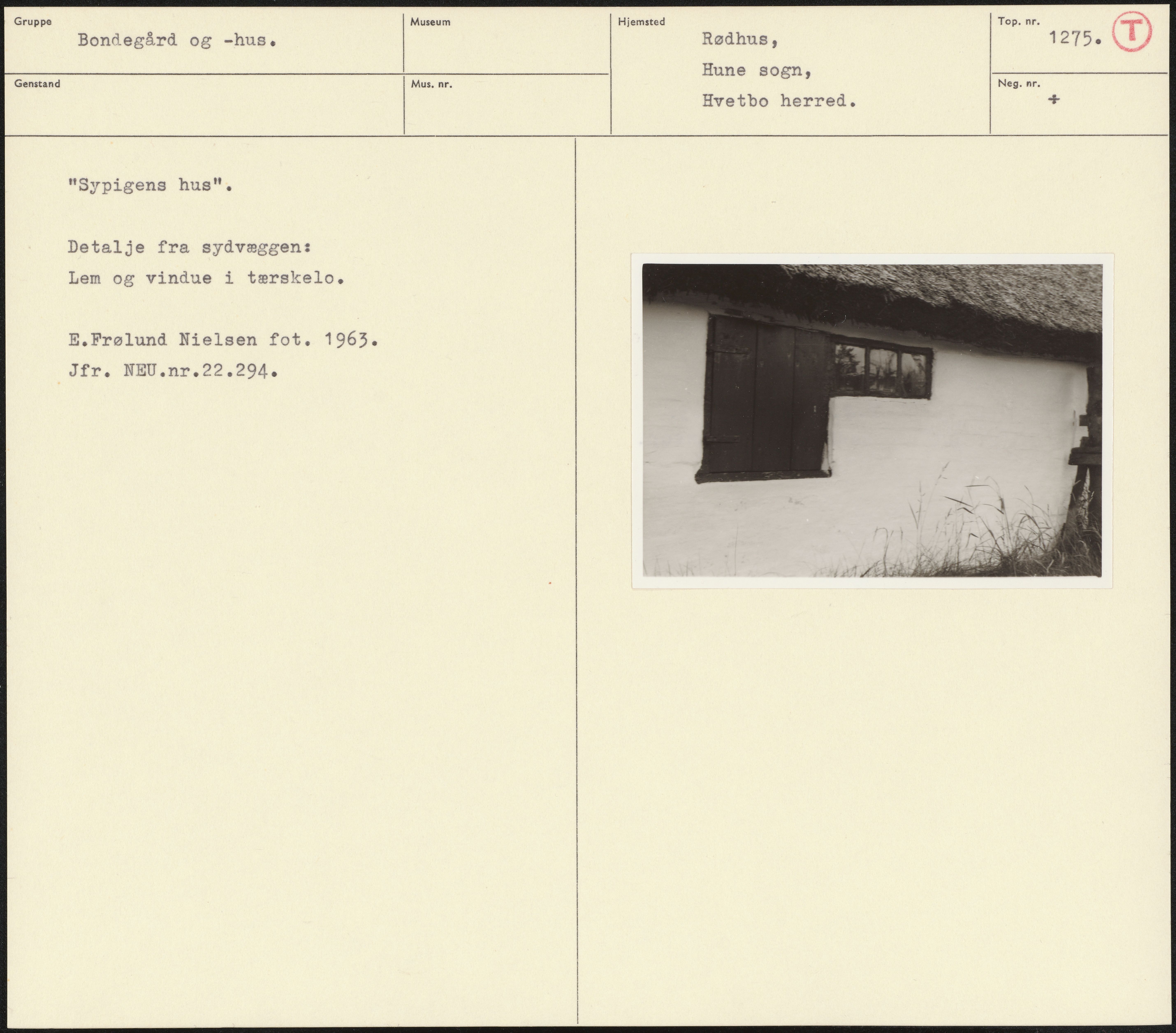 Maskingenkendt tekst fra arkivkort. Sypigens hus". Detalje fra sydvæggen: Lem og vindue i tærskelo. E.Frølund Nielsen fot. 1963. Jfr. NEU.nr.22.294.