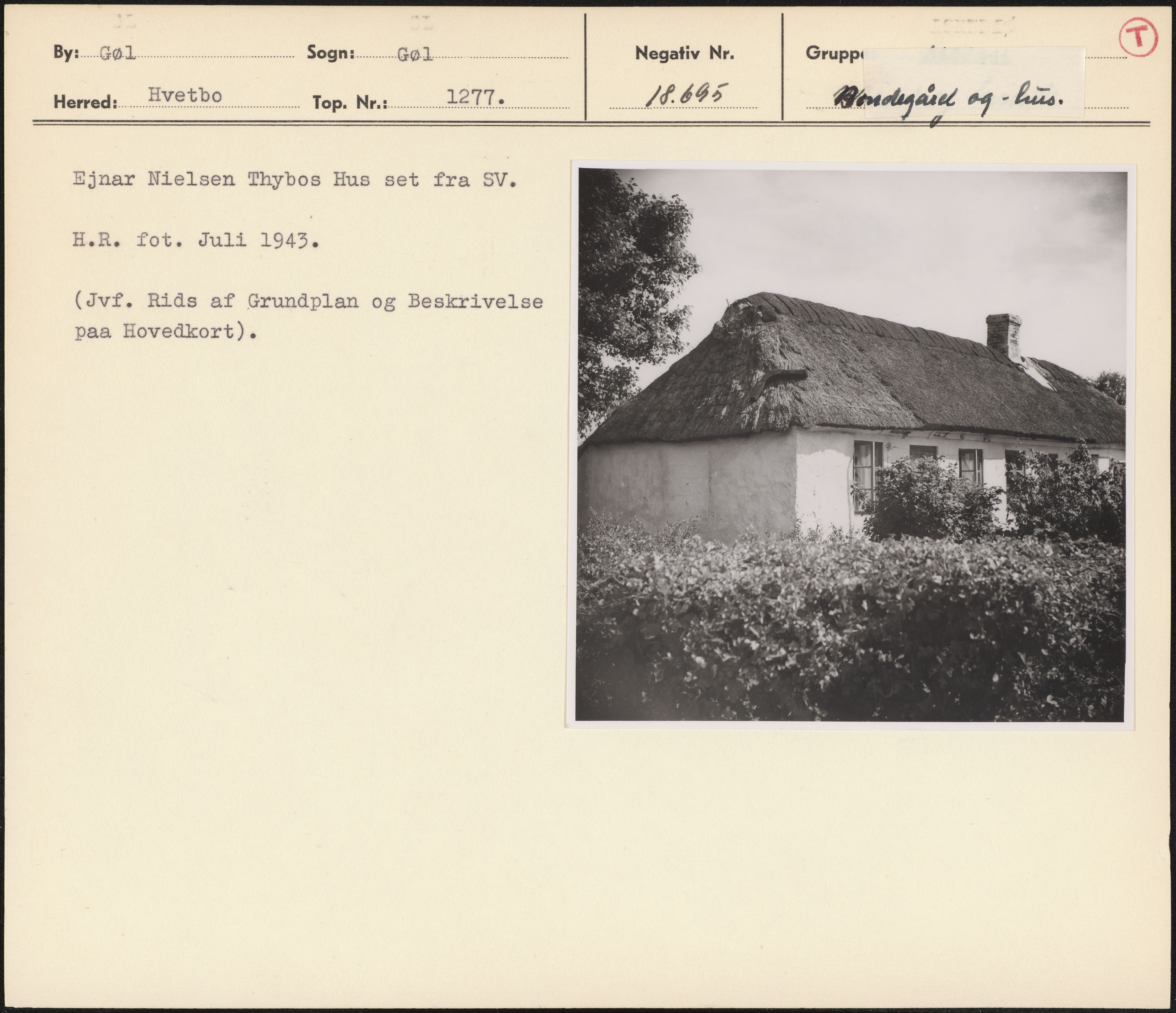Maskingenkendt tekst fra arkivkort. Ejnar Nielsen Thybos Hus set fra SV. H.R. fot. Juli 1943, (Jvf. Rids af Grundplan og Beskrivelse paa Hovedkort).