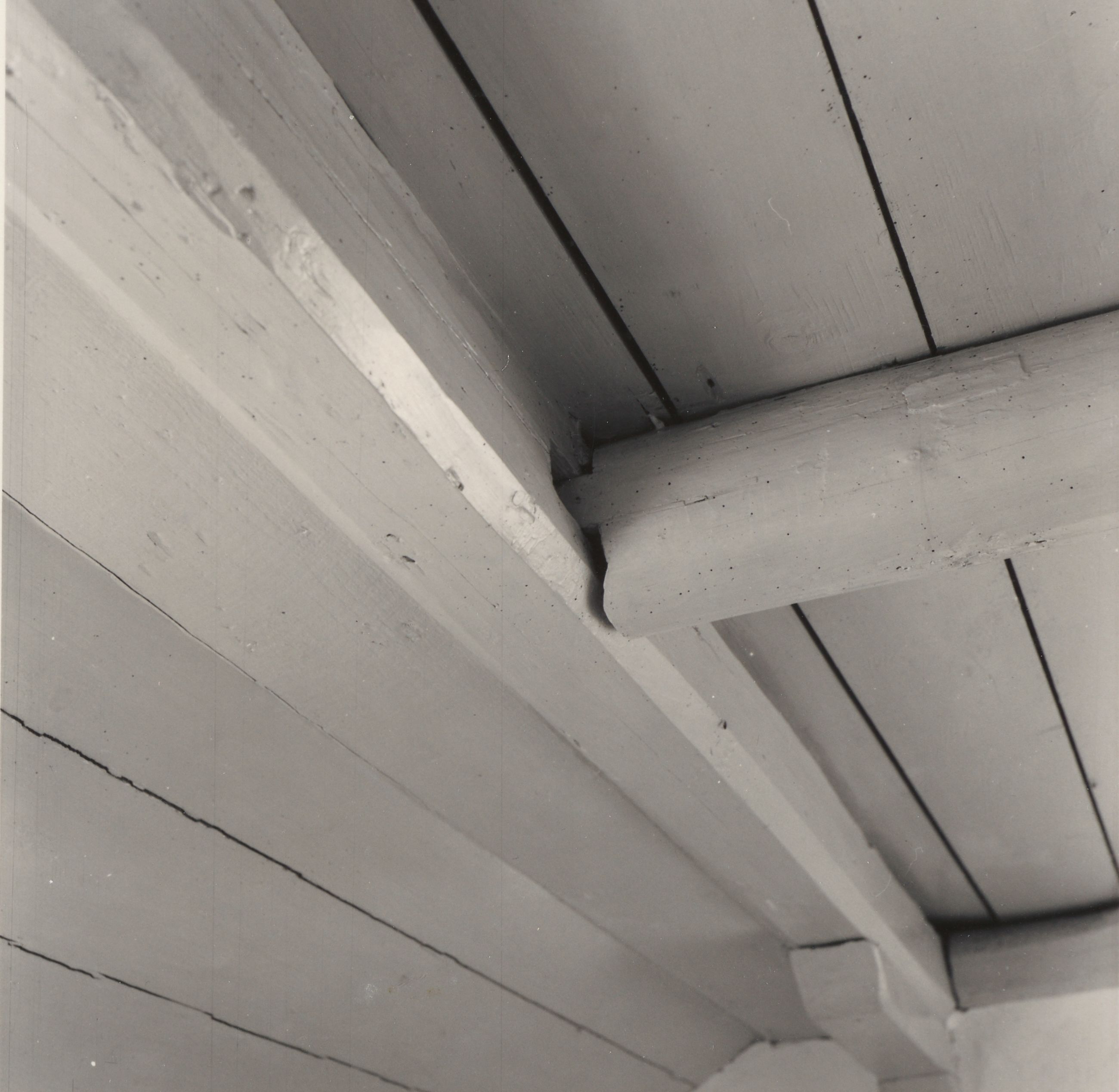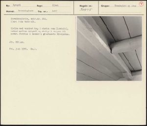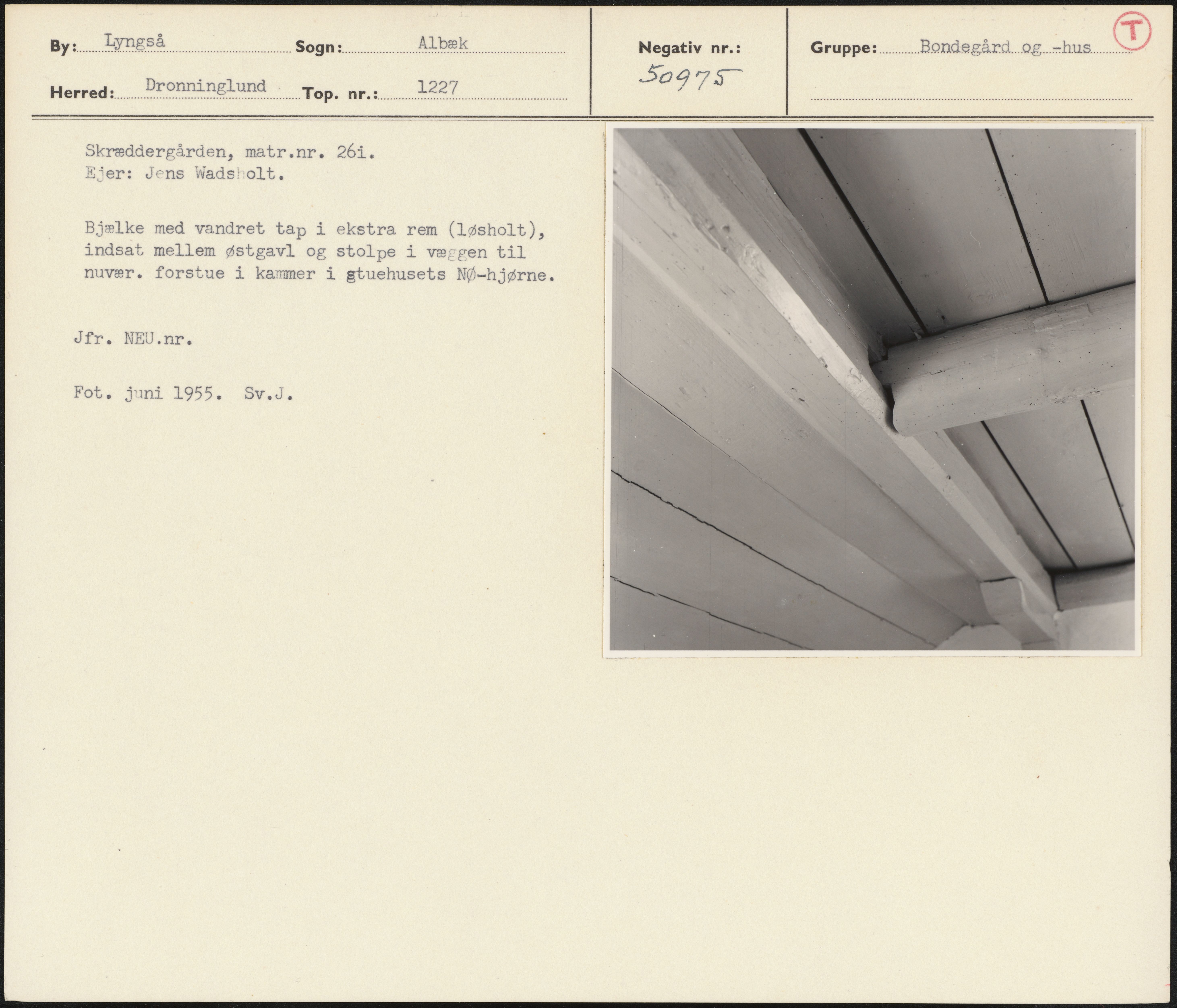 Maskingenkendt tekst fra arkivkort. Skræddergården, matr.nr. 26i. Ejer: Jens Wadsholt. Bjælke med vandret tap i ekstra rem (løsholt), indsat mellem østgavl og stolpe i væggen til nuvær. forstue i kammer i gtuehusets NØ-hjørne. Jfr. NEU.nr. Fot. juni 1955. 5Sv.J.
