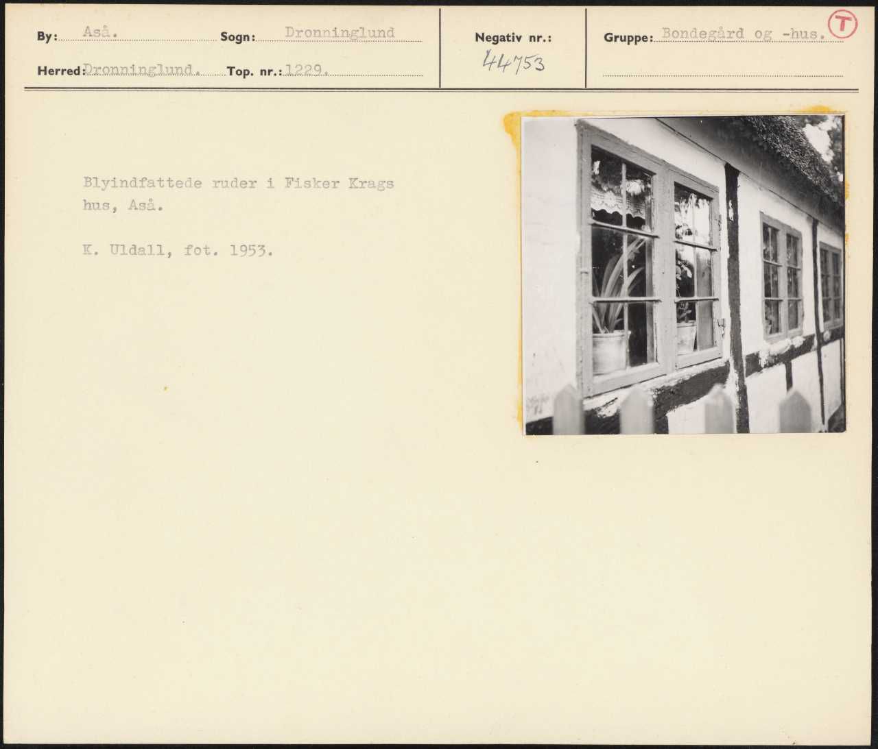 Maskingenkendt tekst fra arkivkort. Blyindfattede ruder i Fisker Krags hus, Aså. K, U1d2a11, fot. 1953.