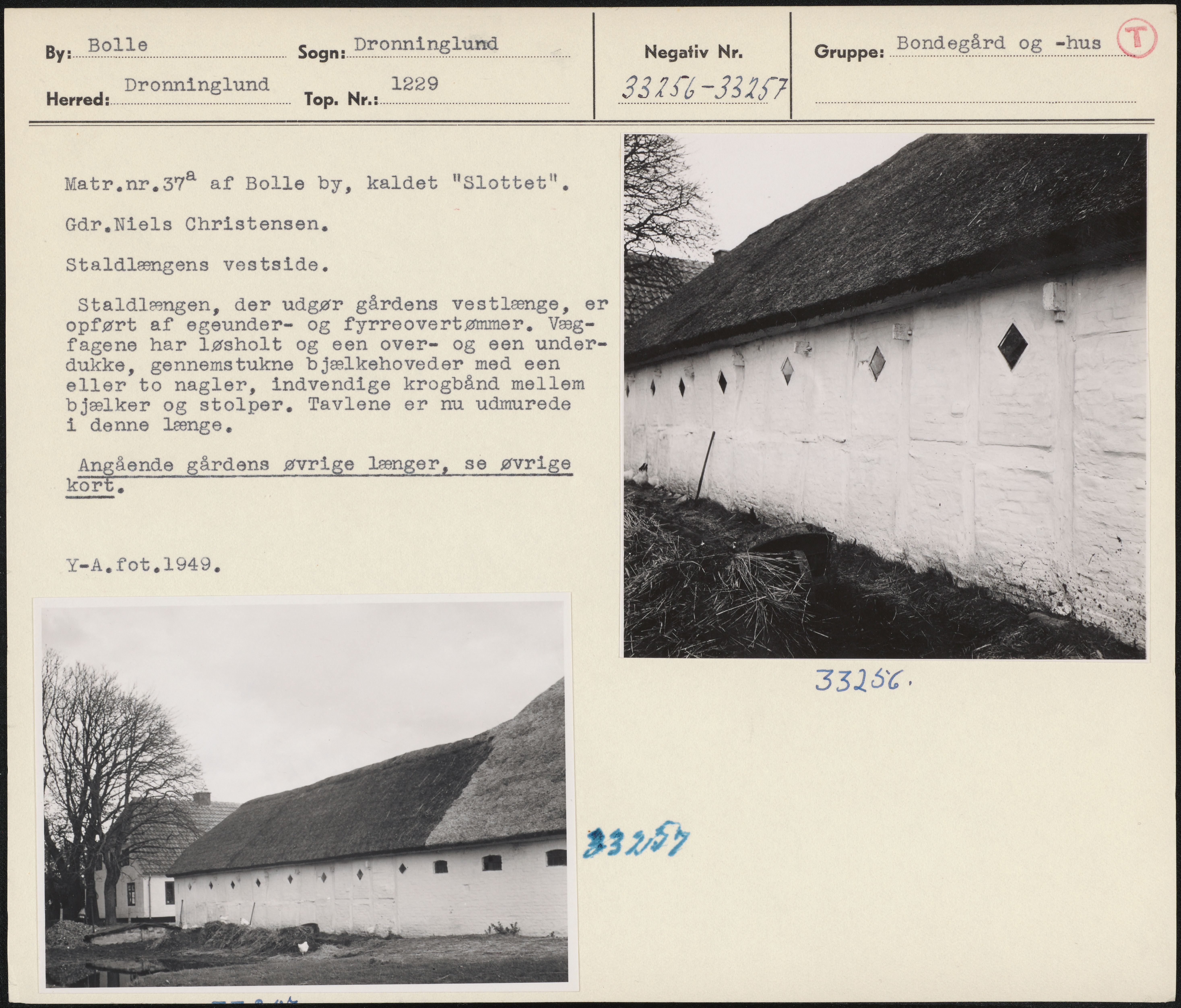Maskingenkendt tekst fra arkivkort. Matr.nr.37 af Bolle by, kaldet "Slottet", Gar,Niels Christensen, Staldlængens vestside. Staldlængen, der udgør gårdens vestlænge, er opført af egeunder- og fyrreovertømmer, Væg- fagene har løsholt og een over- og een under- dukke, gennemstukne bjælkehoveder med een eller to nagler, indvendige krogbånd mellem bjælker og stolper, Tavlene er nu udmurede i denne længe, Angionde gårdens øvrige længer, se øvrige kort. Y-A.fot,1949; 33156