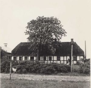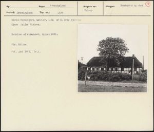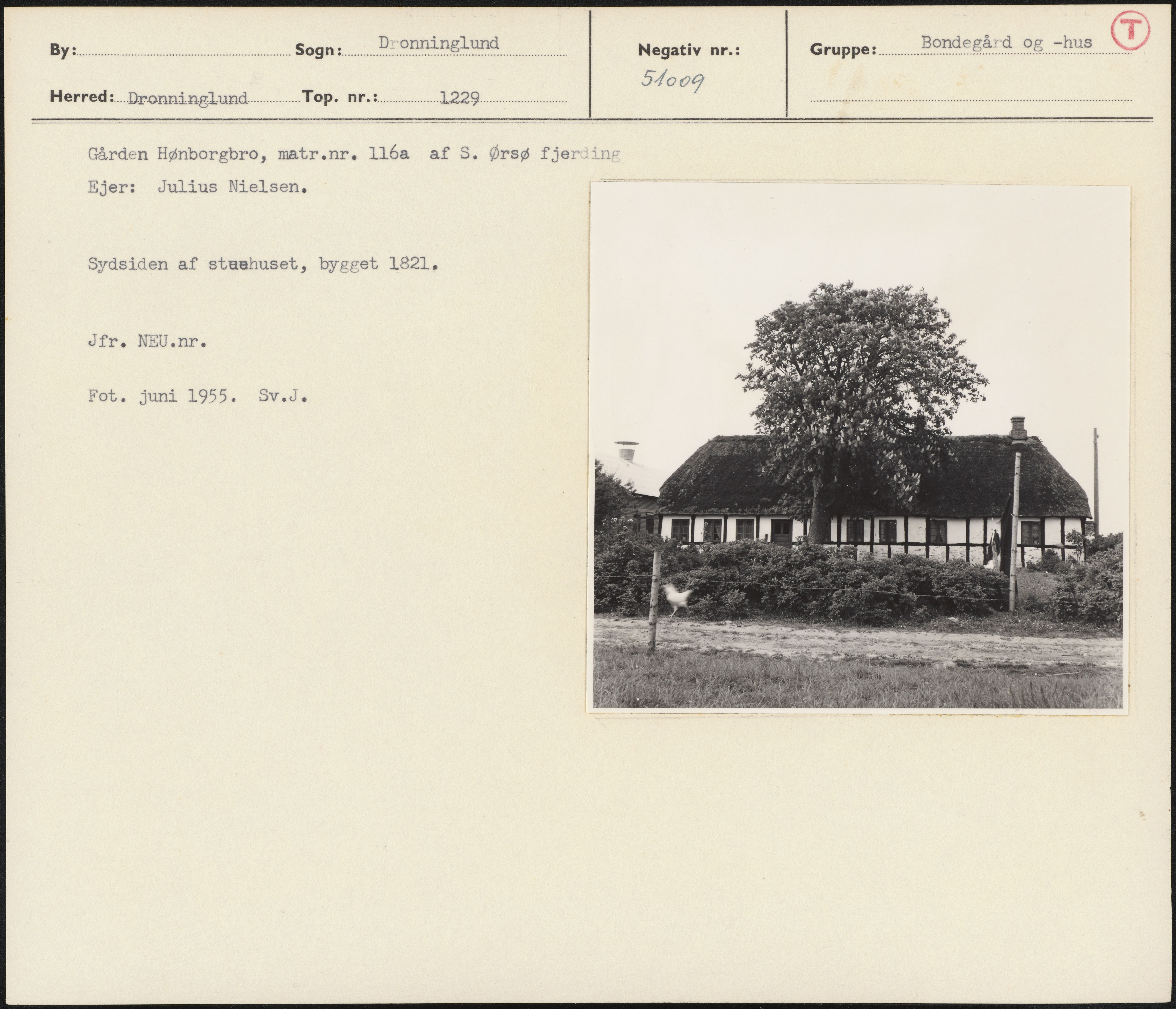 Maskingenkendt tekst fra arkivkort. Gården Hønborgbro, matr.nr. 116a af S. Ørsø fjerding Ejer: Julius Nielsen. Sydsiden af stuahuset, bygget 1821, Jfr. NEU.nr. Fot. juni 1955. Sv.Jd.
