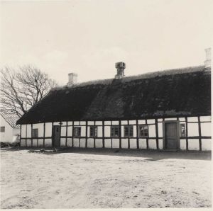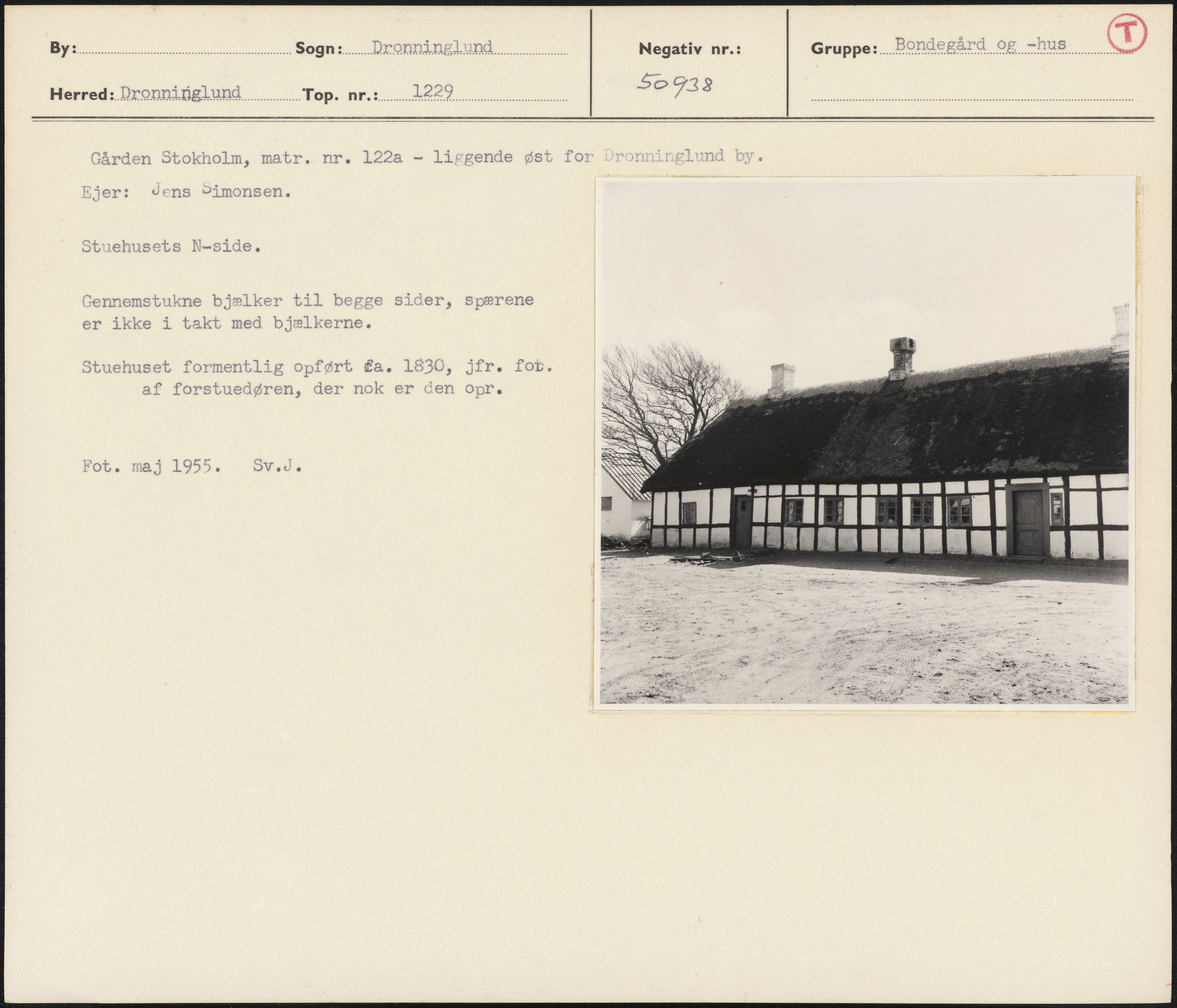 Maskingenkendt tekst fra arkivkort. Gården Stokholm, matr. nr. 122a - liggende øst for Dronninglund by. Ejer: Jens »imonsen. > Stuehusets N-side. Gennemstukne bjælker til begge sider, spærene er ikke i takt med bjælkerne. Stuehuset formentlig opført fa. 1830, jfr. fot. af forstuedøren, der nok er den opr. Fot. maj 1955> 5Sv.J.
