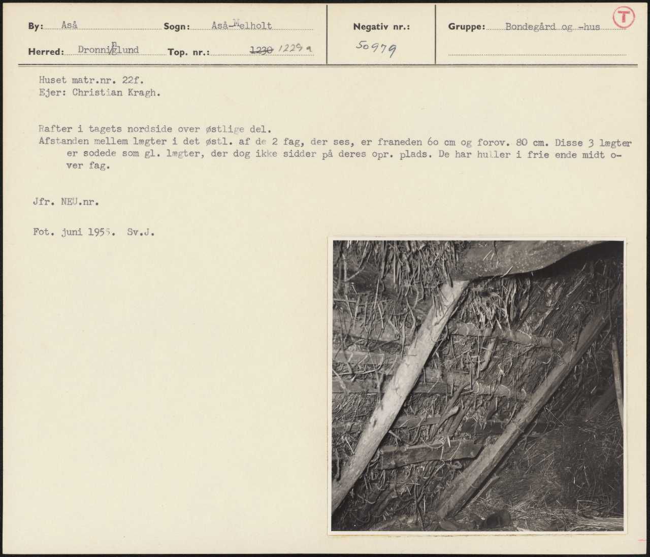 Maskingenkendt tekst fra arkivkort. Huset matr.nr. 22f. Ejer: Christian Kragh. nm Rafter i tagets nordside over østlige del. Afstanden mellem lægter i det østl. af de 2 fag, der ses, er franeden 60 cm og forov. 80 cm. Disse 3 lægter er sodede som gl. lægter, der dog ikke sidder på deres opr. plads. De har huller i frie ende midt o- ver fag. Jfr. NEU.nr. Fot. juni 1955. 5Sv.J.
