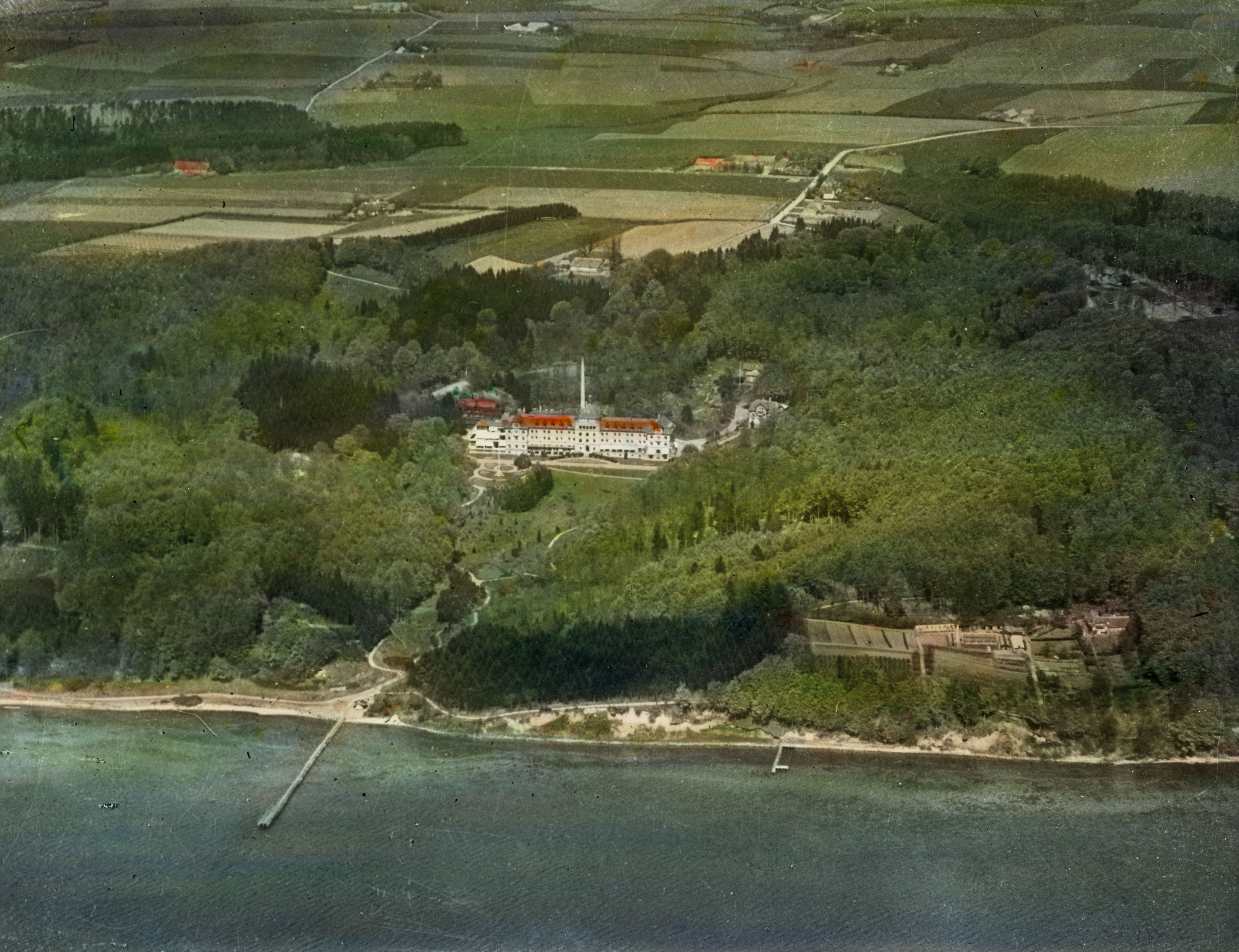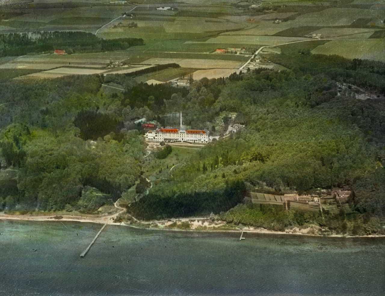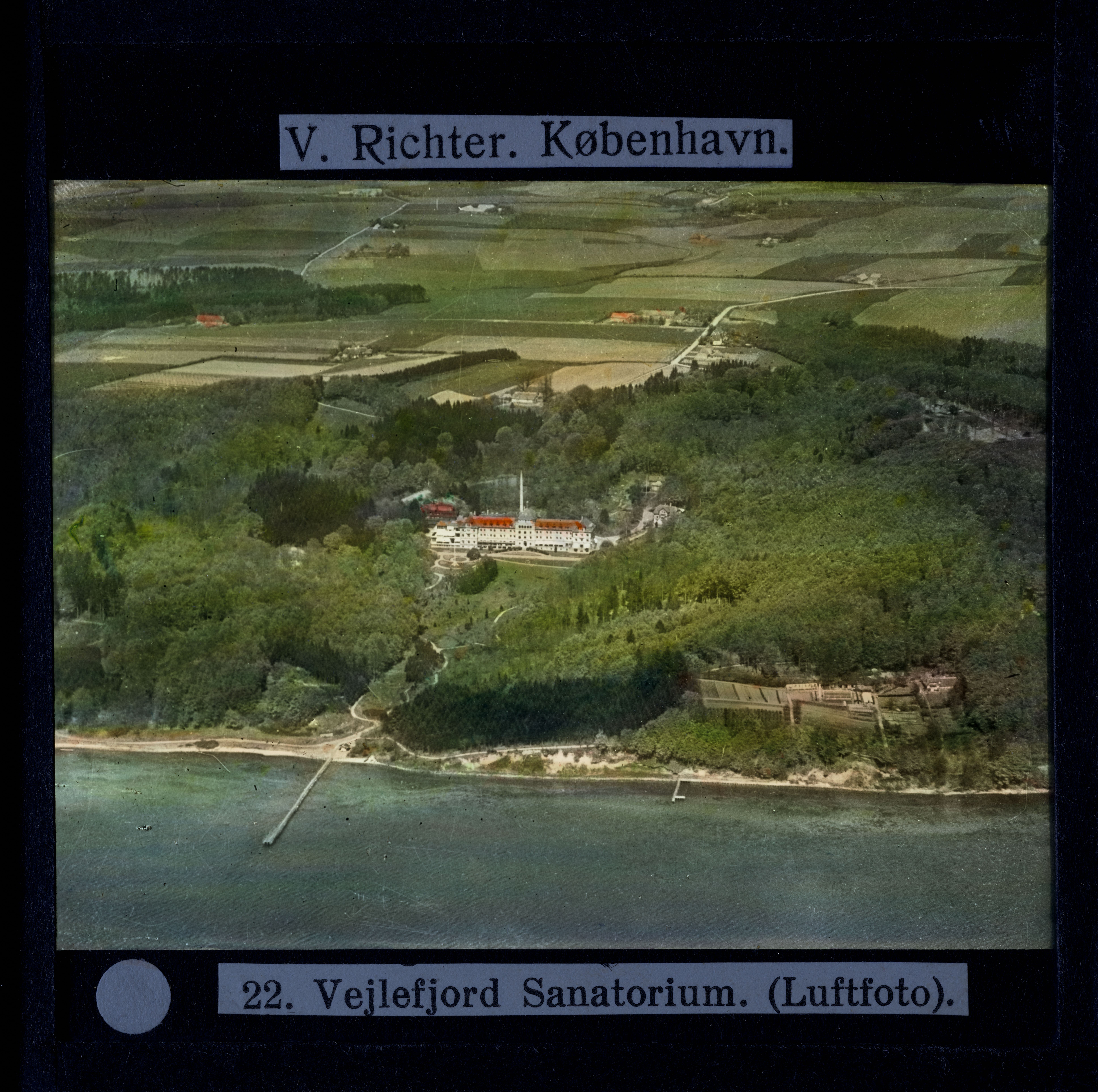 Titel hentet fra original dias. Billedet er håndkoloreret og stammer fra lysbilledserie nr. 222 benævnt "Gennem Østjylland". På dias er påsat labels: "V. Richter. København." og "22. Vejlefjord Sanatorium. (Luftfoto).". I serien er 55 lysbilleder. Firmaet V. Richter producerede, kuraterede og distribuerede lysbilledserier i primært 1920'erne og 1930'erne. Dias måler ca. 8 x 8 cm.