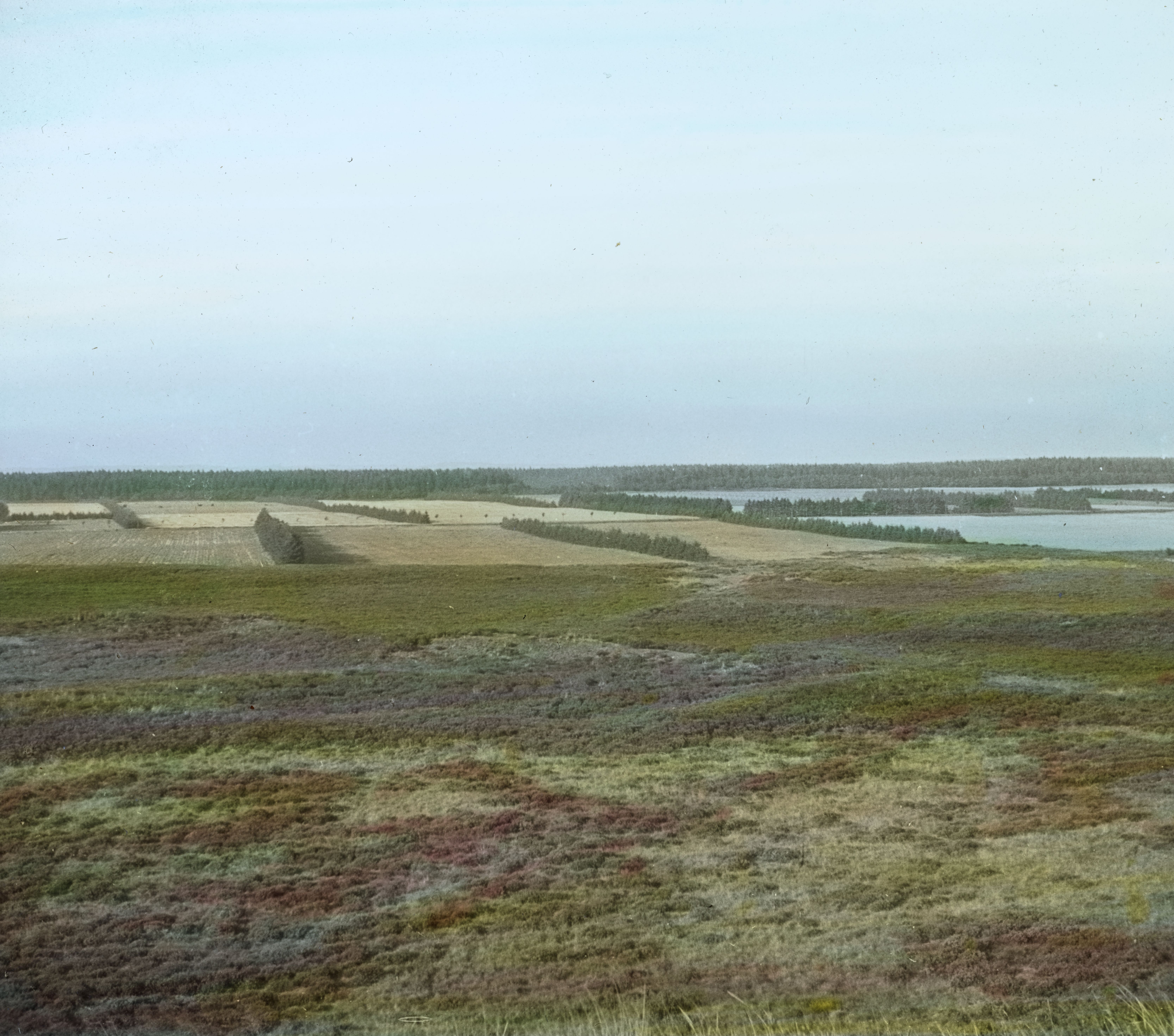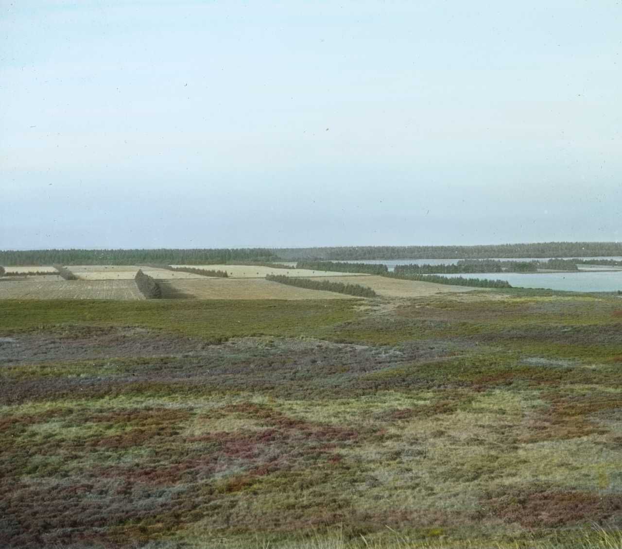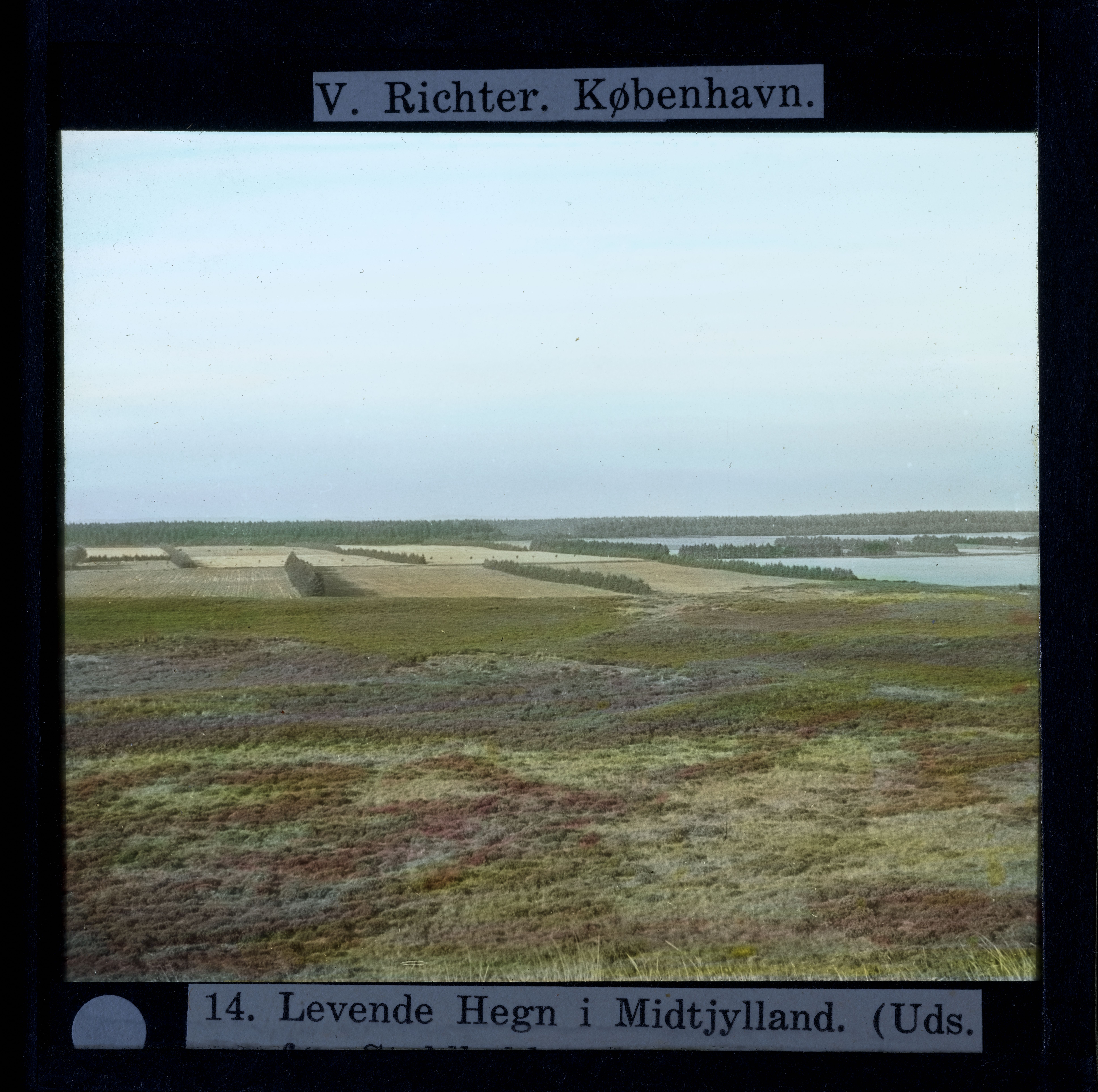 Titel hentet fra original dias. Billedet er håndkoloreret og stammer fra lysbilledserie nr. 223 benævnt "Midtjylland". På dias er påsat labels: "V. Richter. København." og "14. Levende Hegn i Midtjylland. (Uds. [resten af teksten er ej læsbar].". I serien er 52 lysbilleder. Firmaet V. Richter producerede, kuraterede og distribuerede lysbilledserier i primært 1920'erne og 1930'erne. Dias måler ca. 8 x 8 cm.